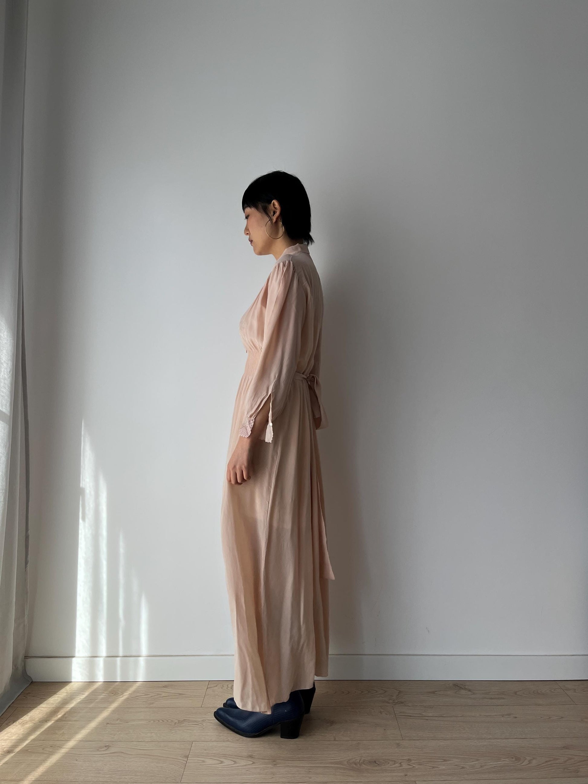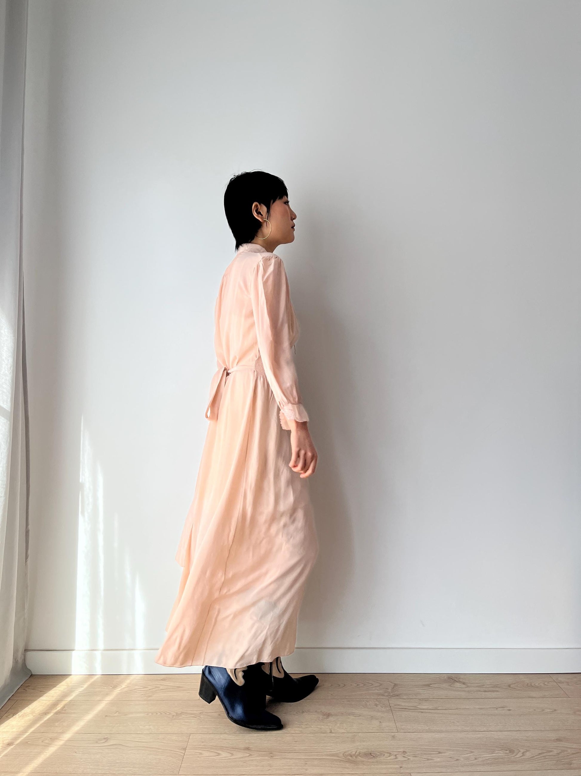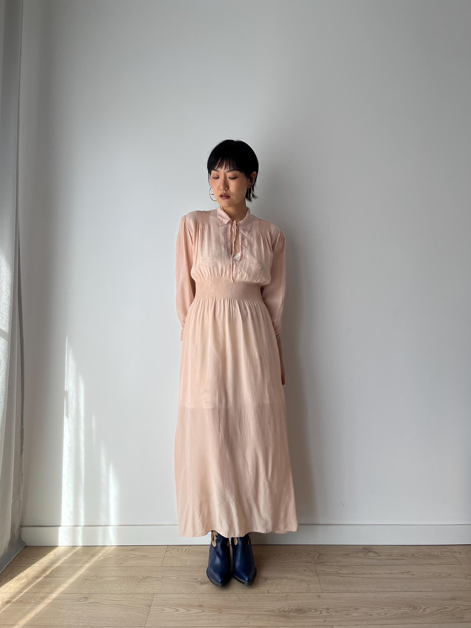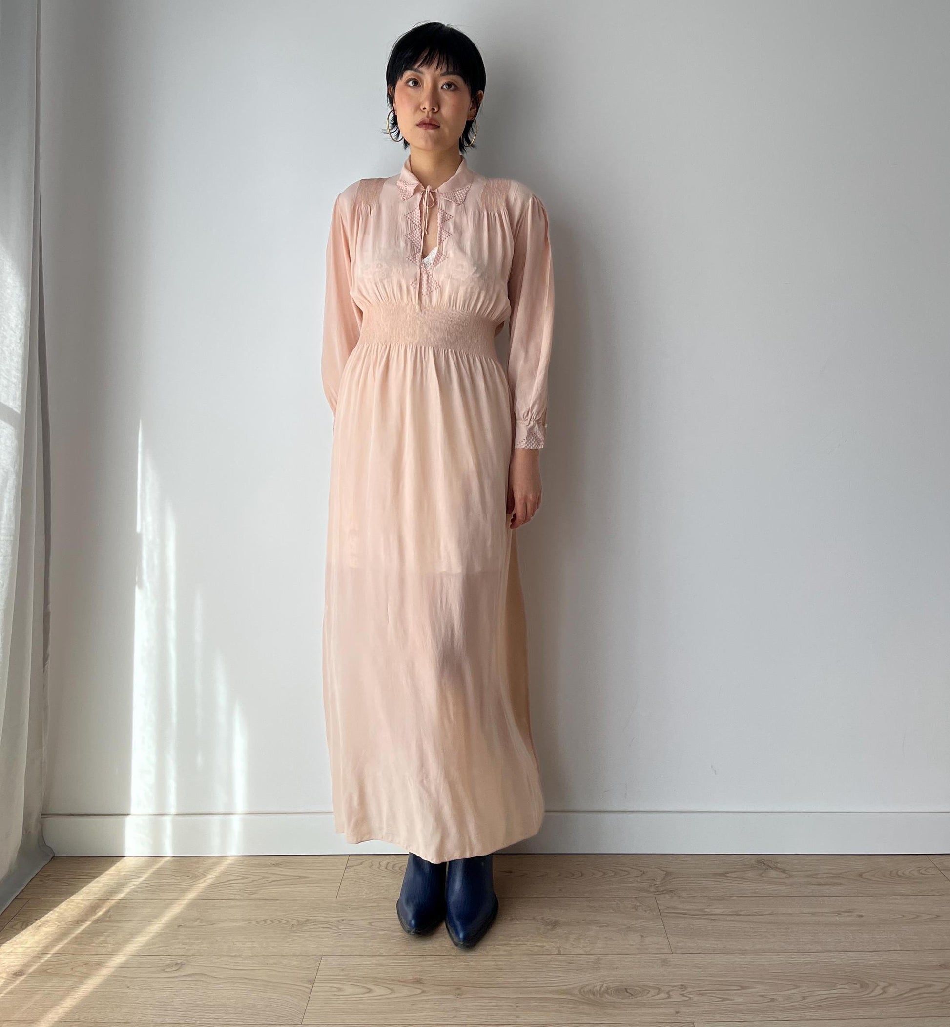 Antique 1930s 1940s pink color long sleeves silk lace embroidered nightgown maxi lingerie bridal dress