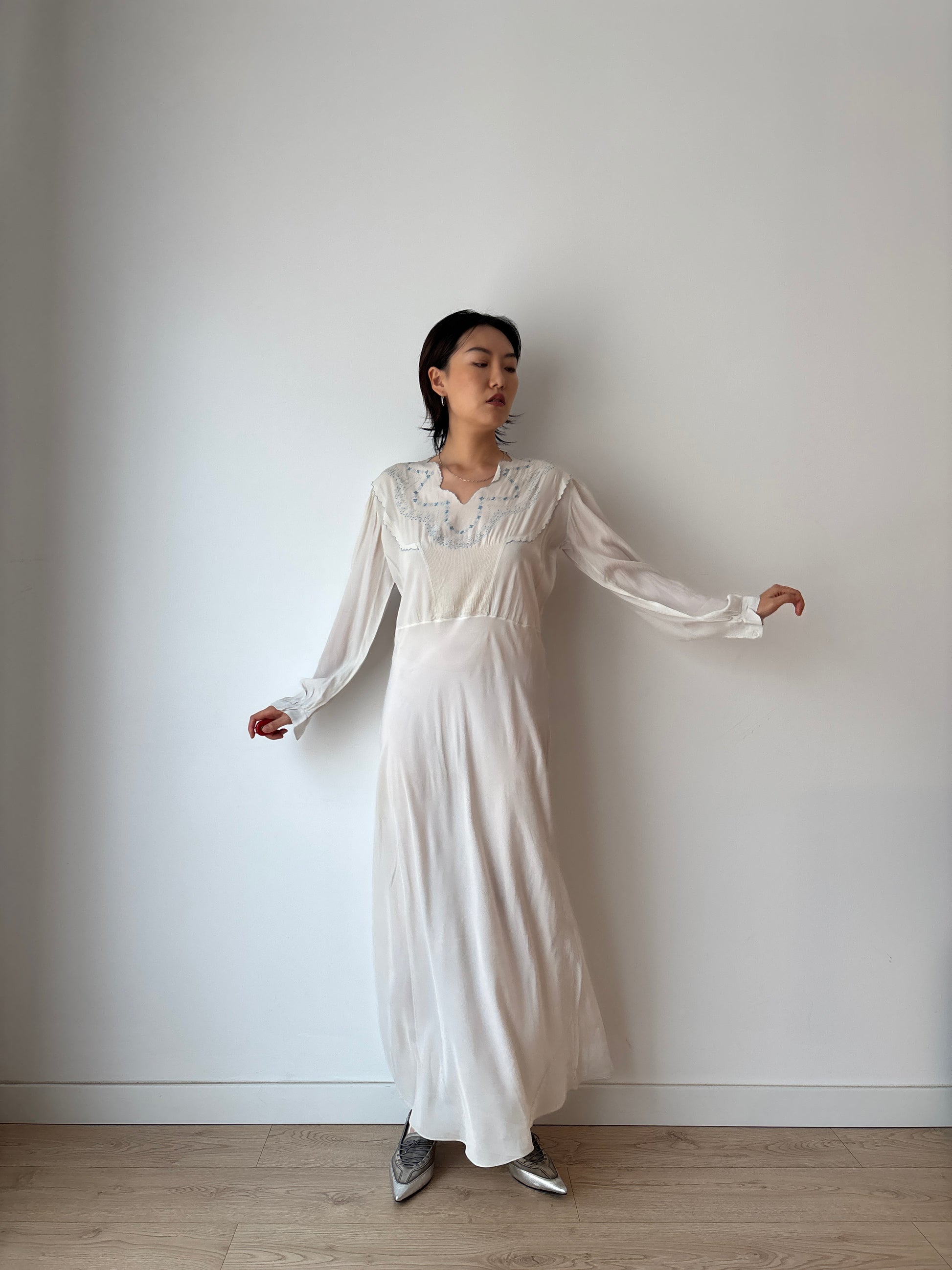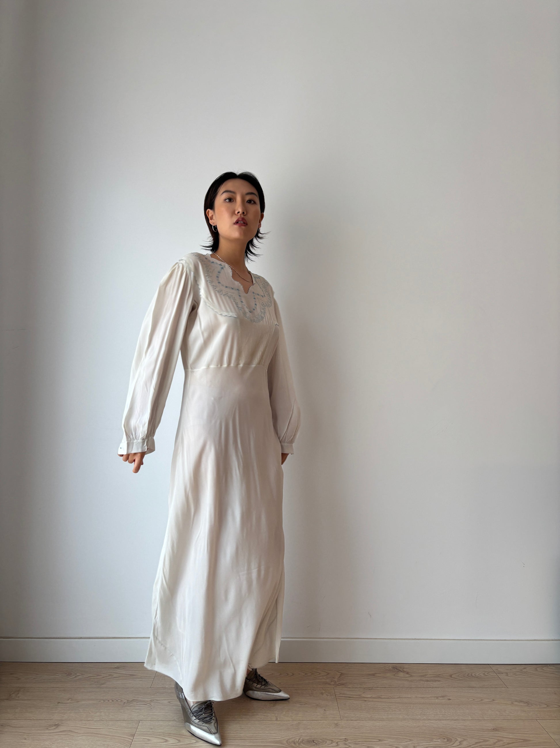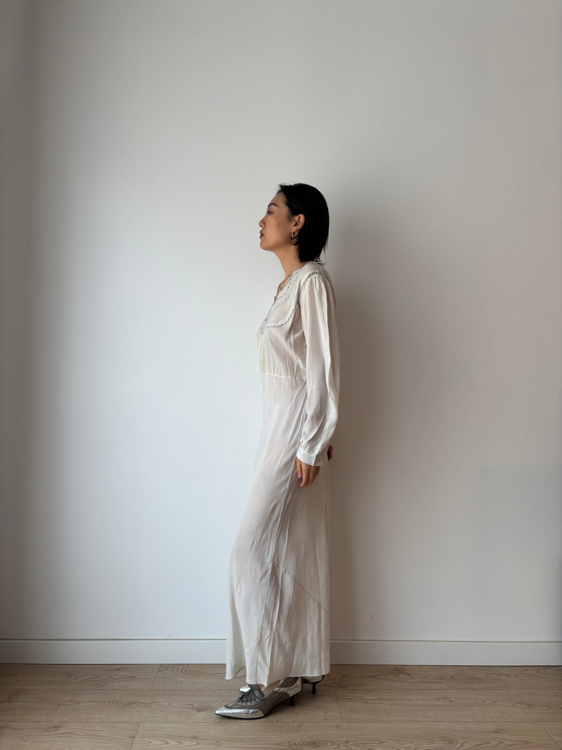 Antique 1930s bias cut pure silk crepe romantic long sleeve nightgown,