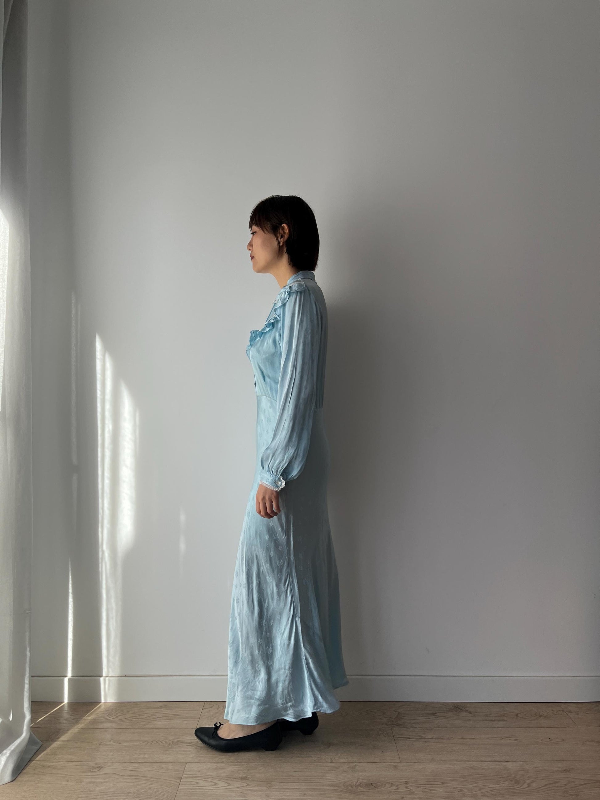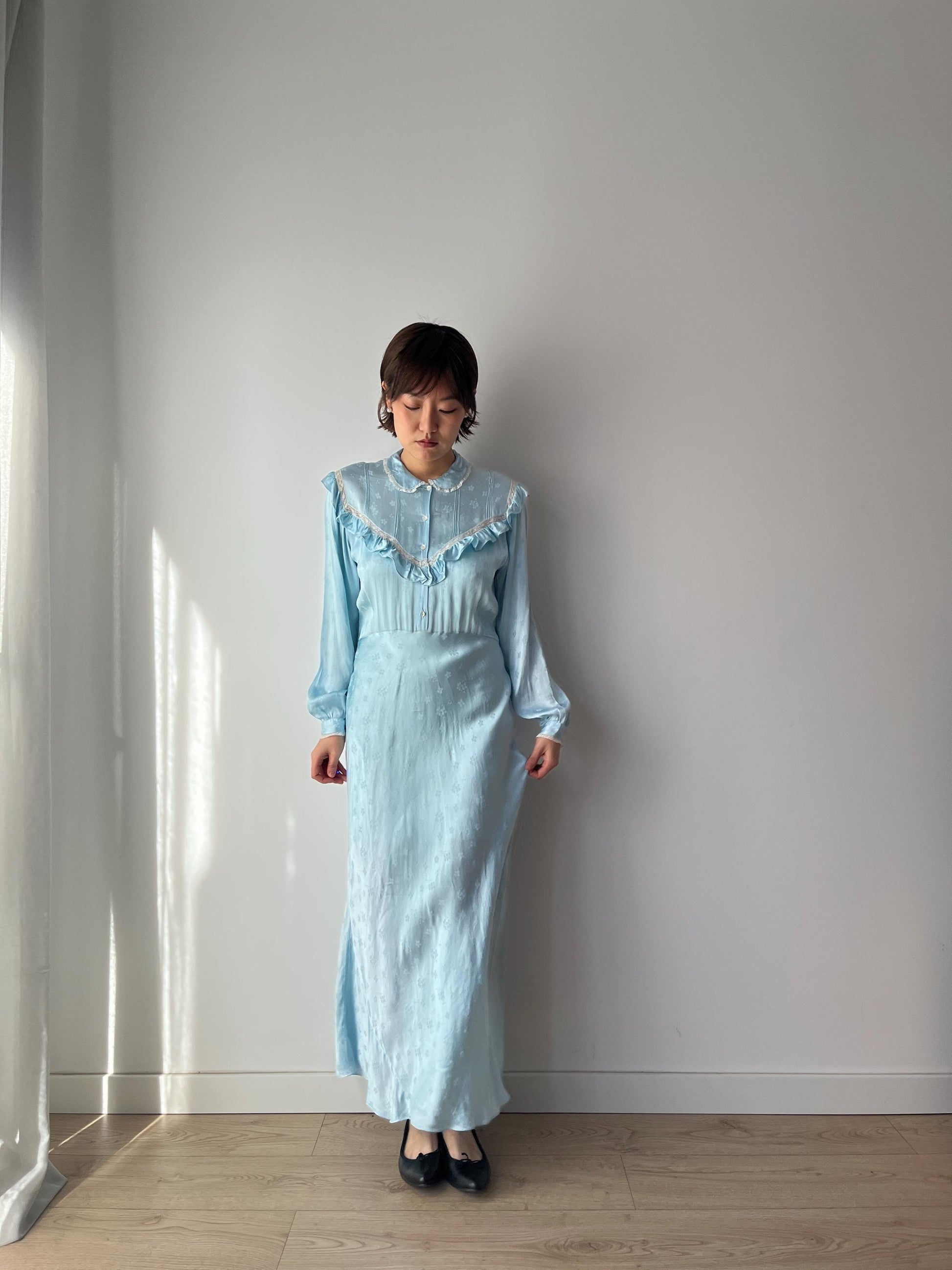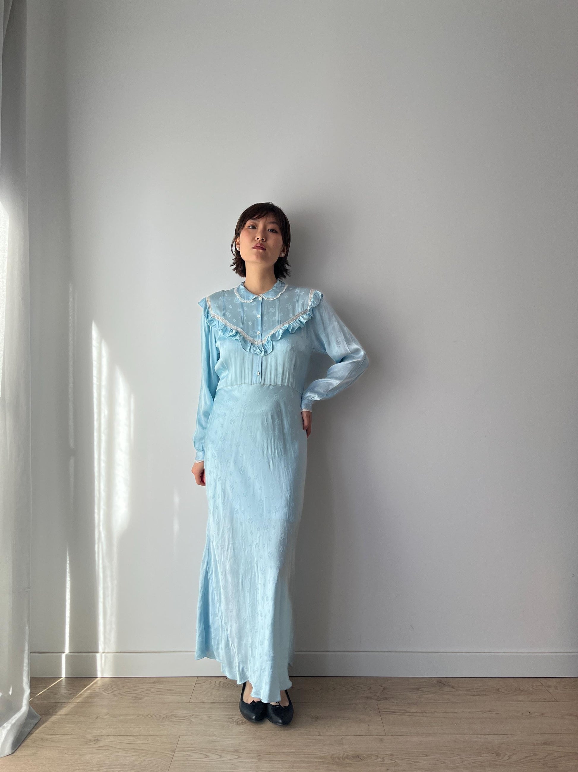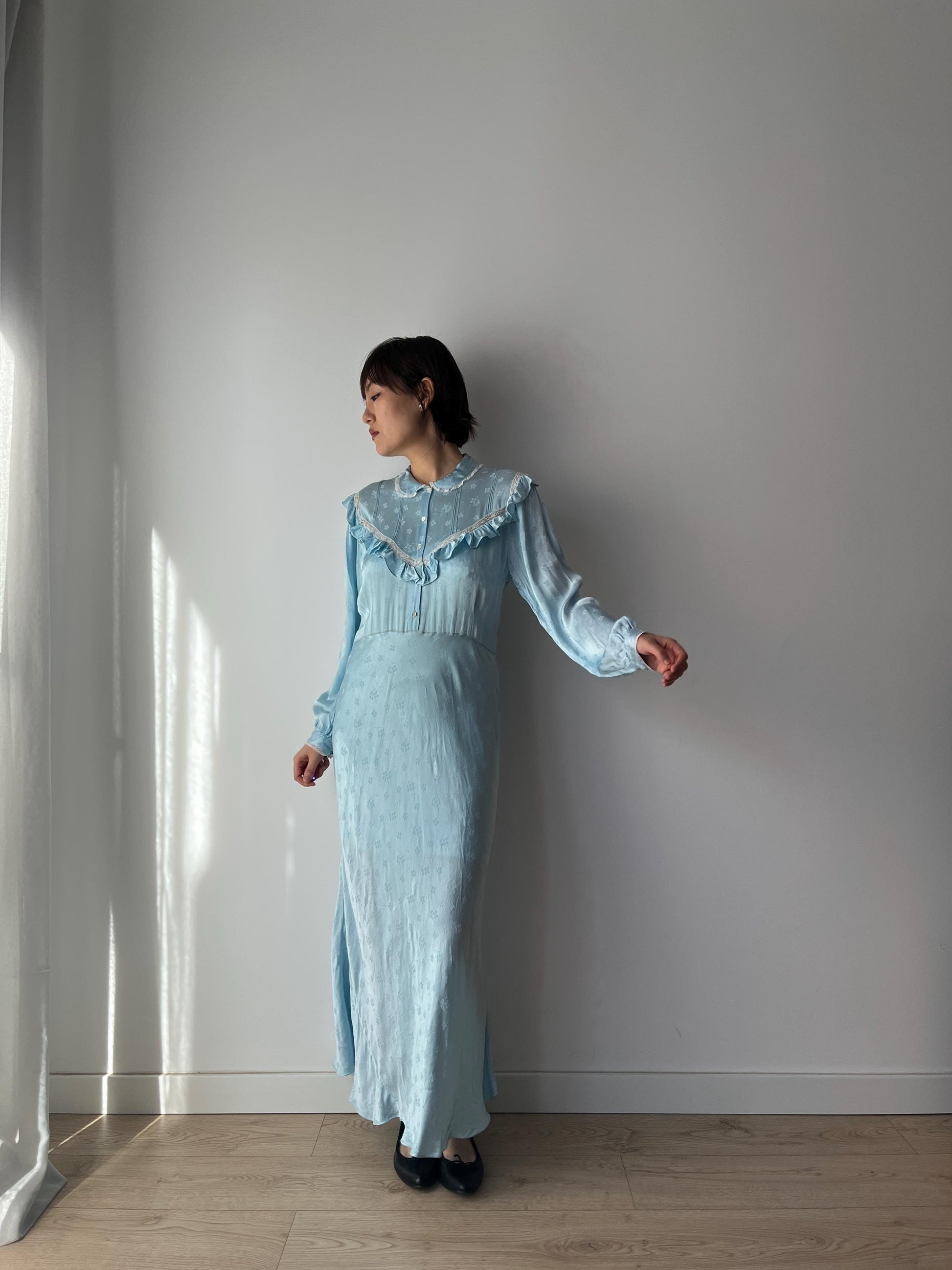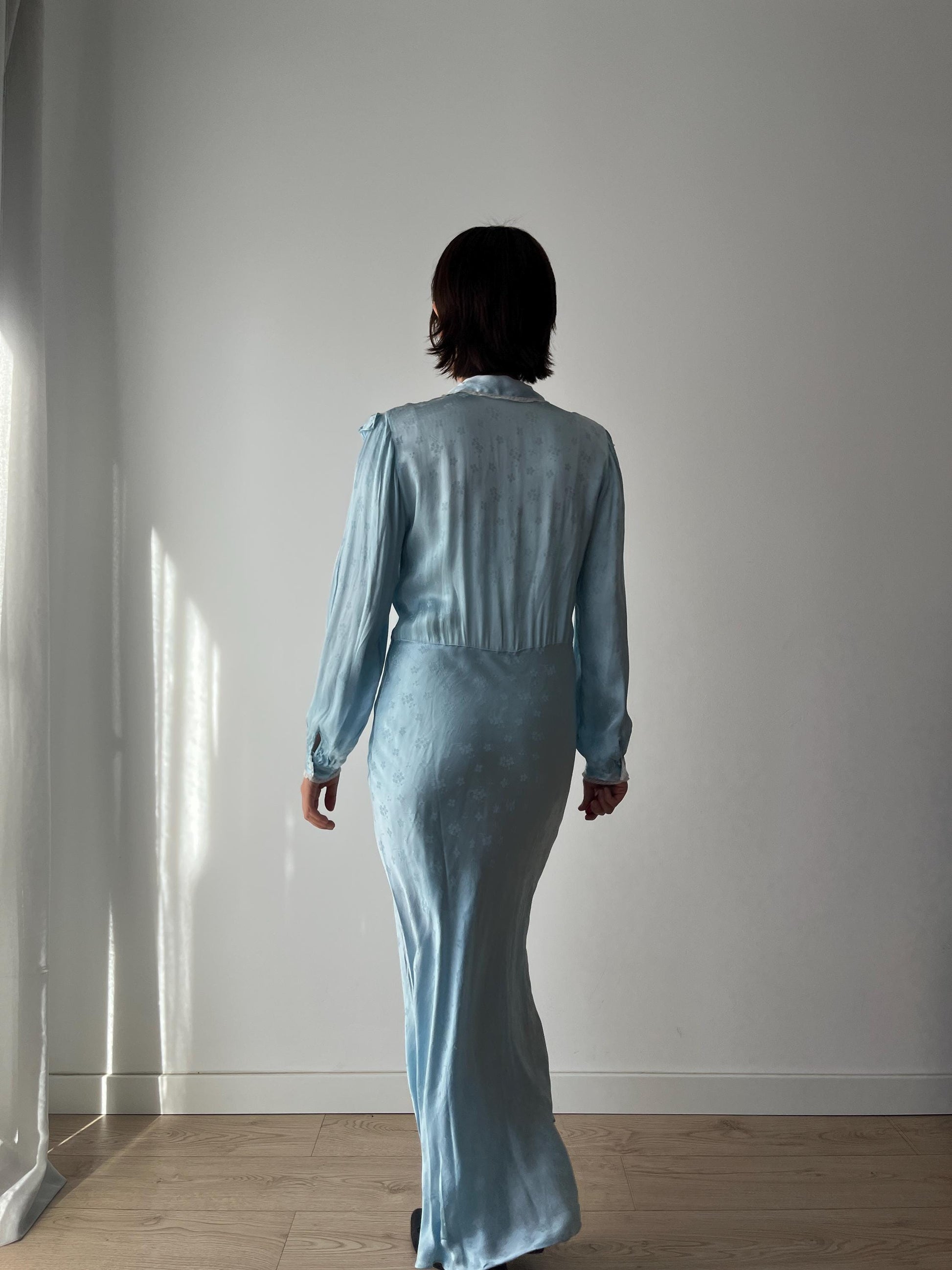 Antique 1930s 1940s blue long sleeves silk satin nightgown maxi lingerie bridal long dress with floral prints