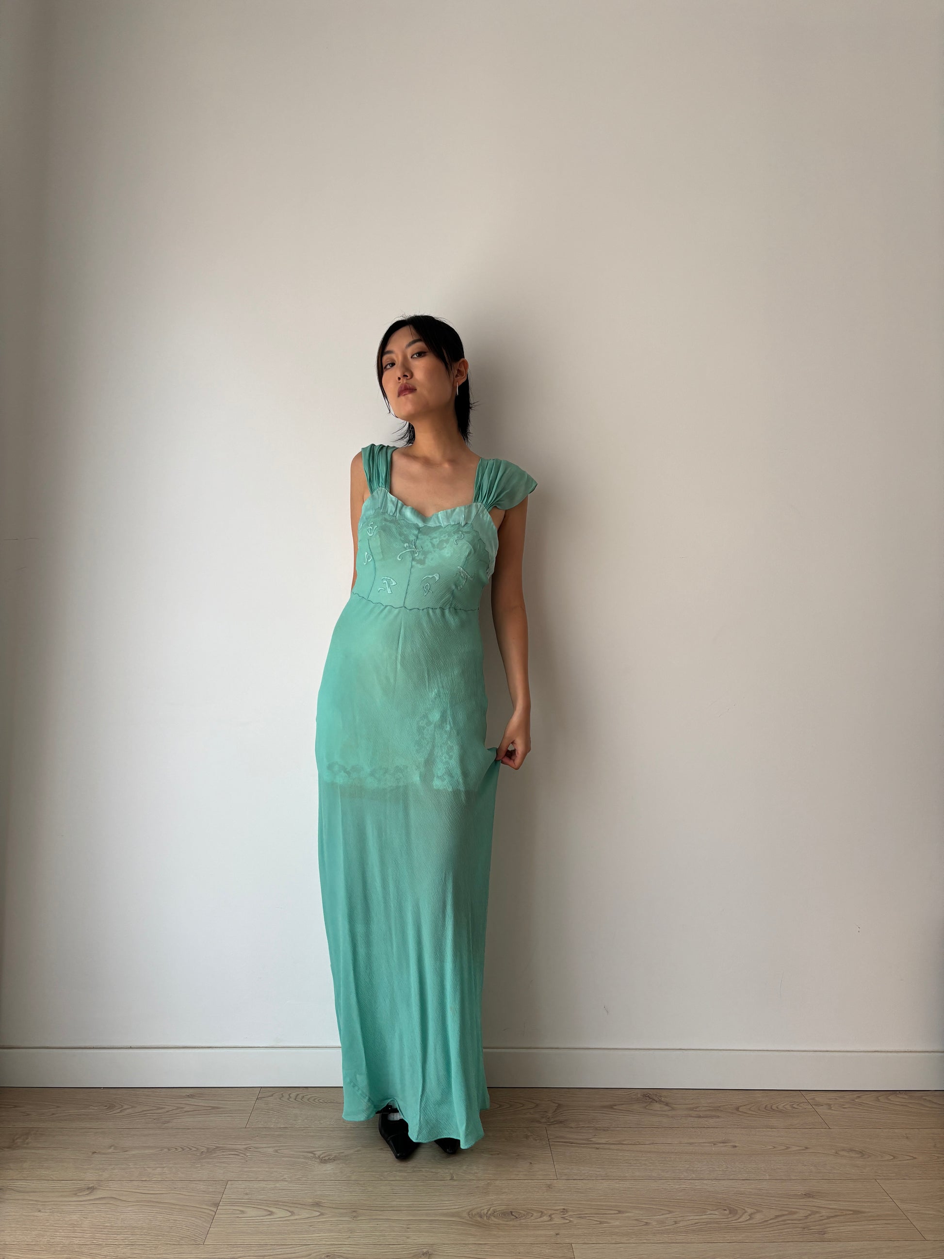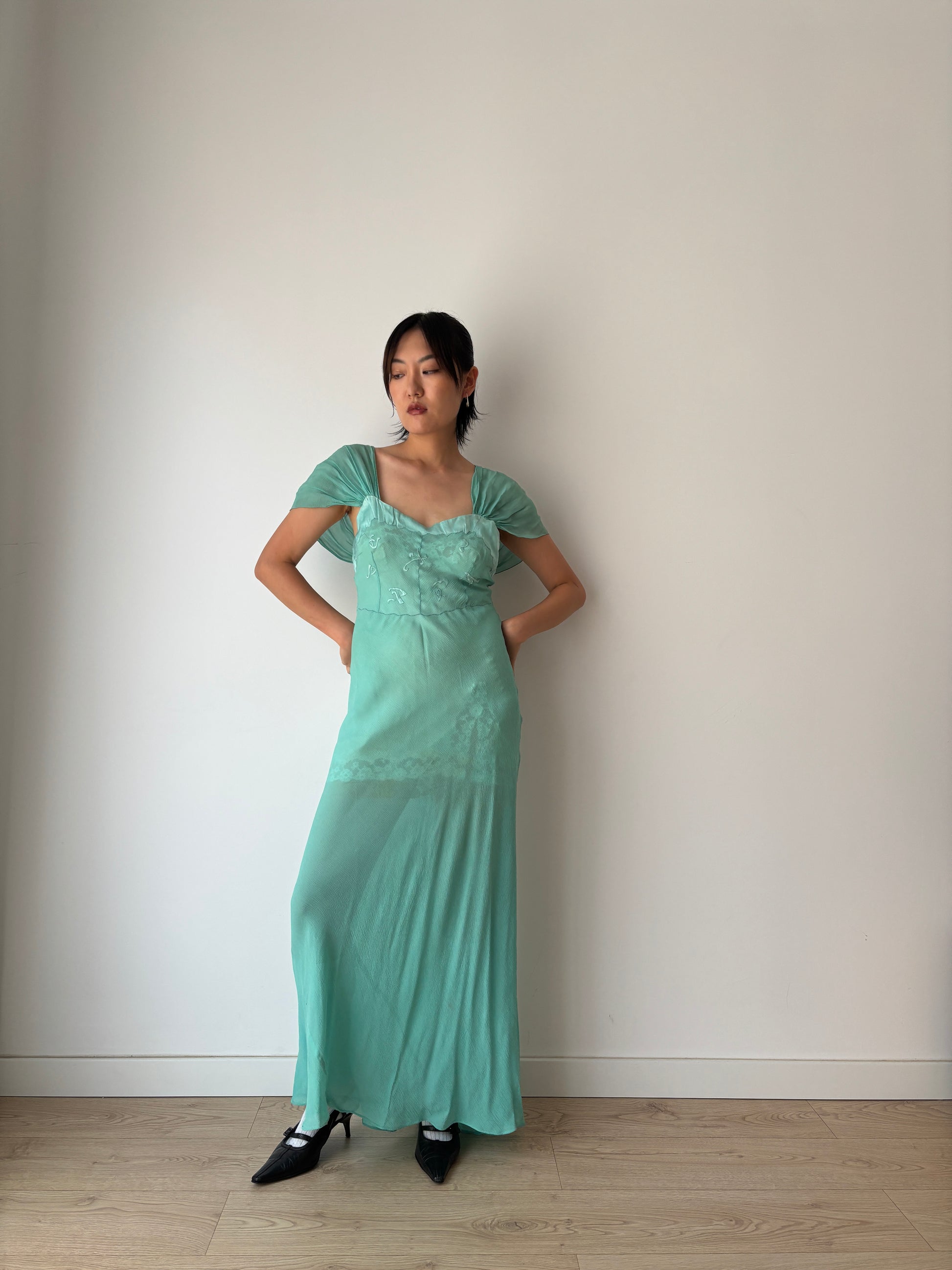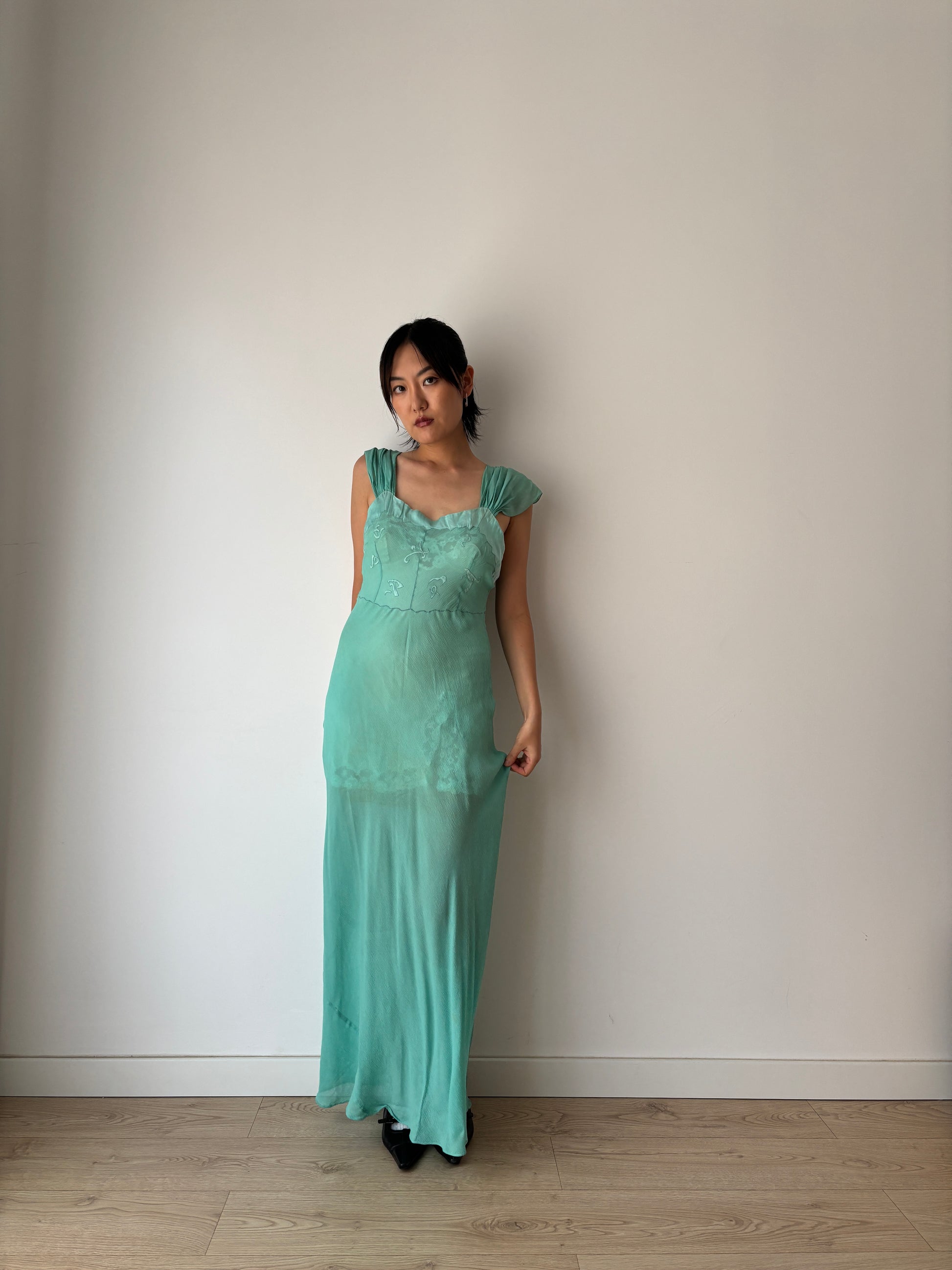 Antique 1930s green pure silk chiffon bias cut maxi dress