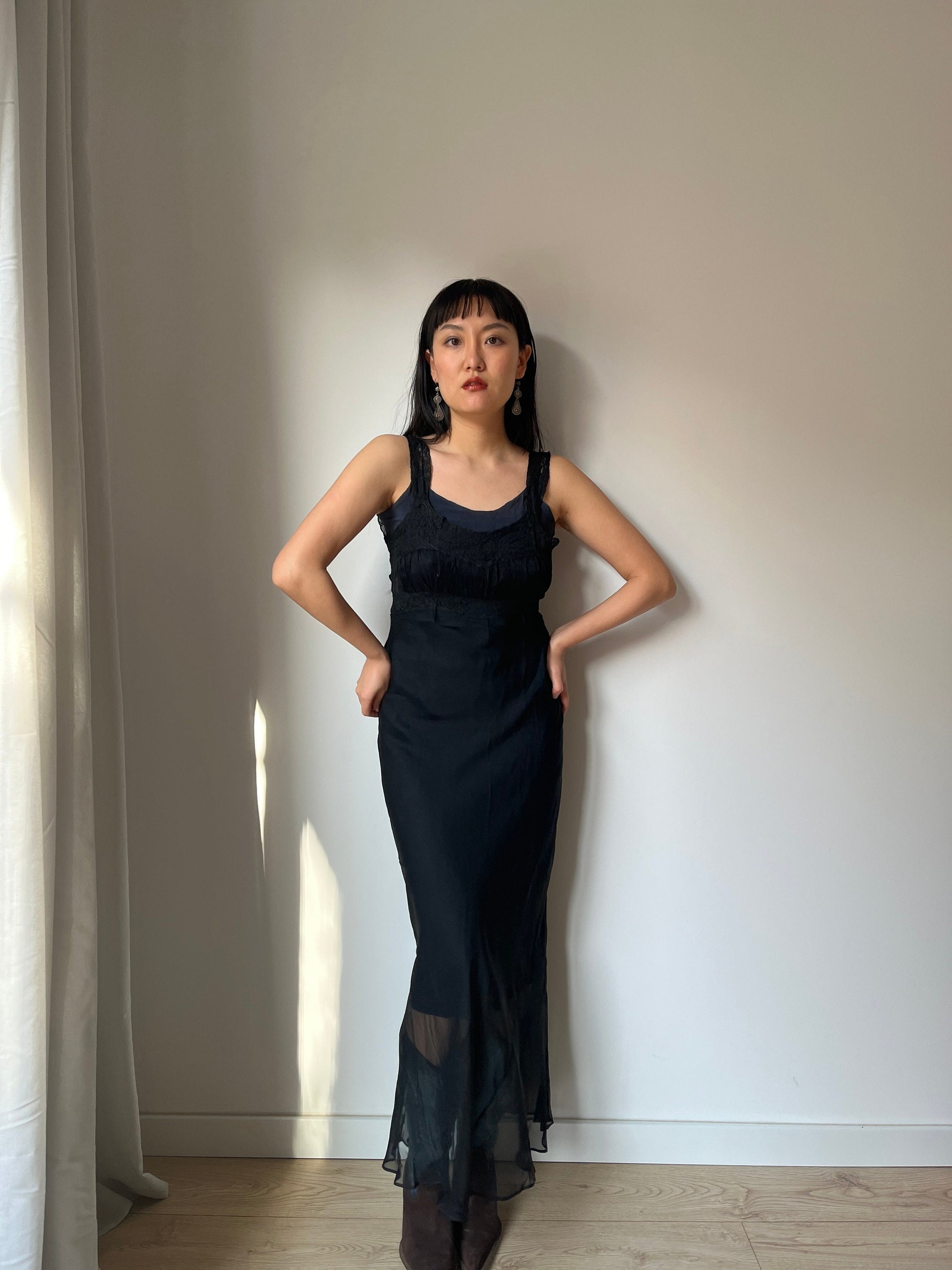 Antique 1950s black sheer crepe bias cut liquid translucent nightdress, lace art deco nightgown