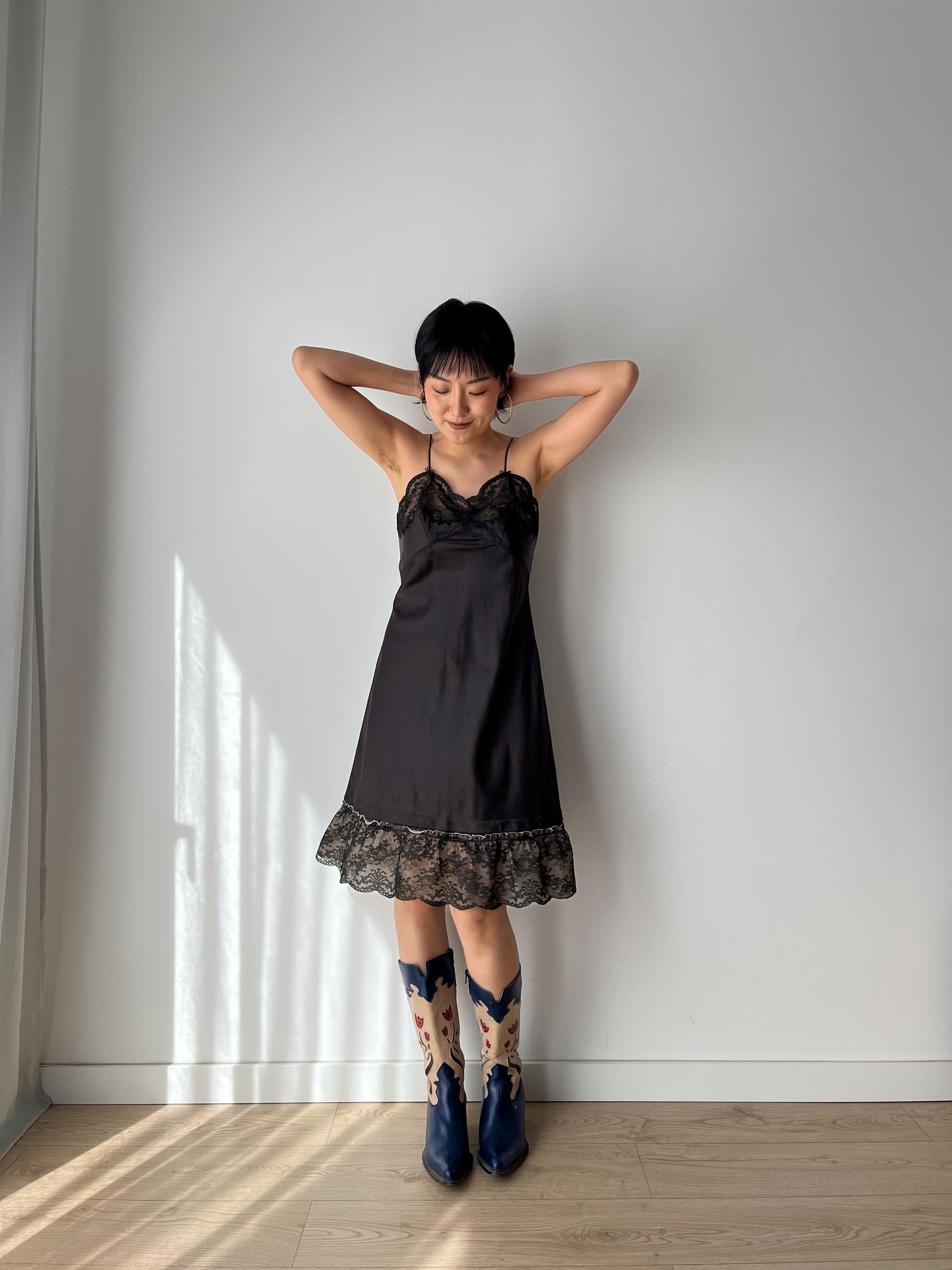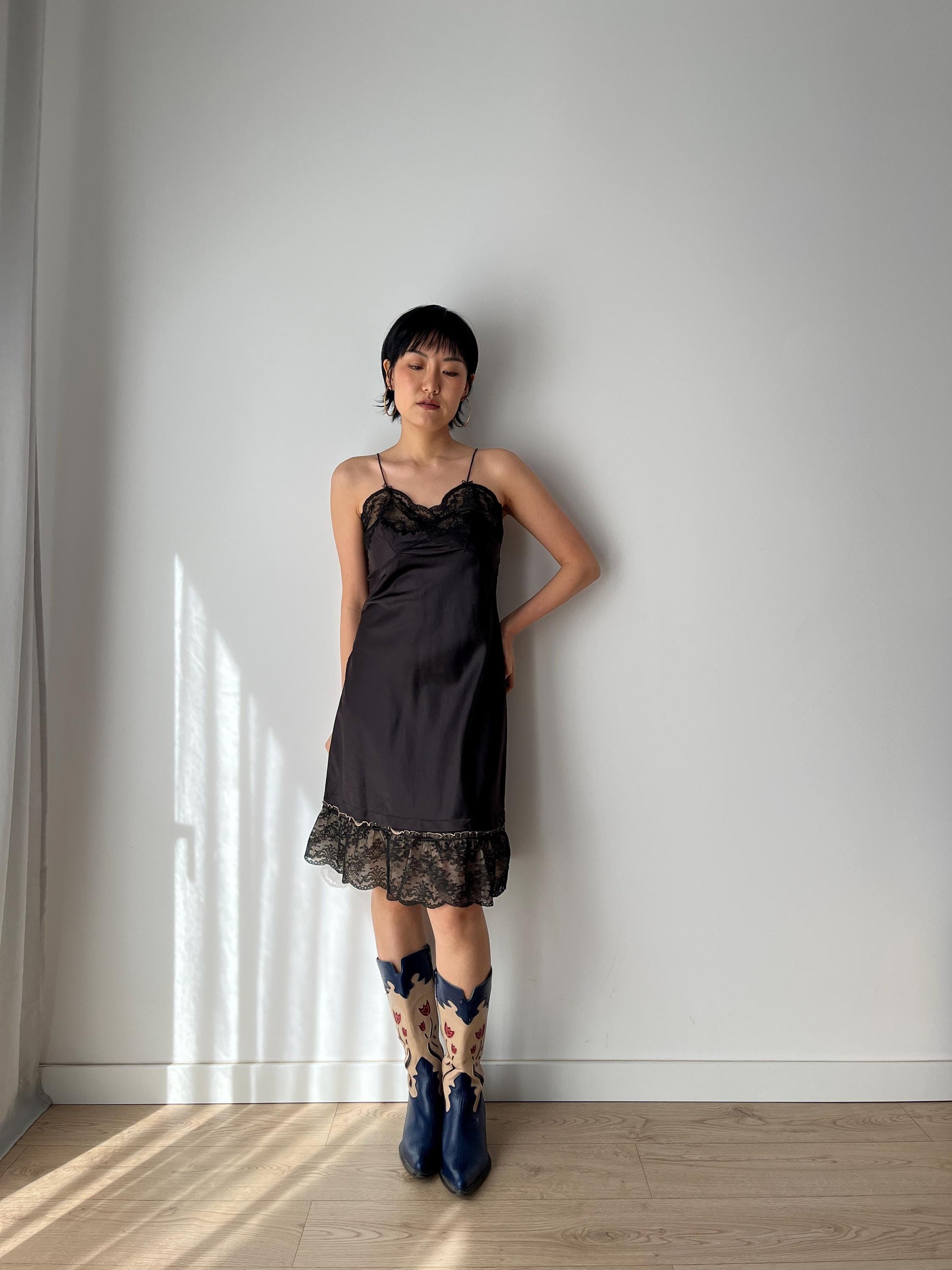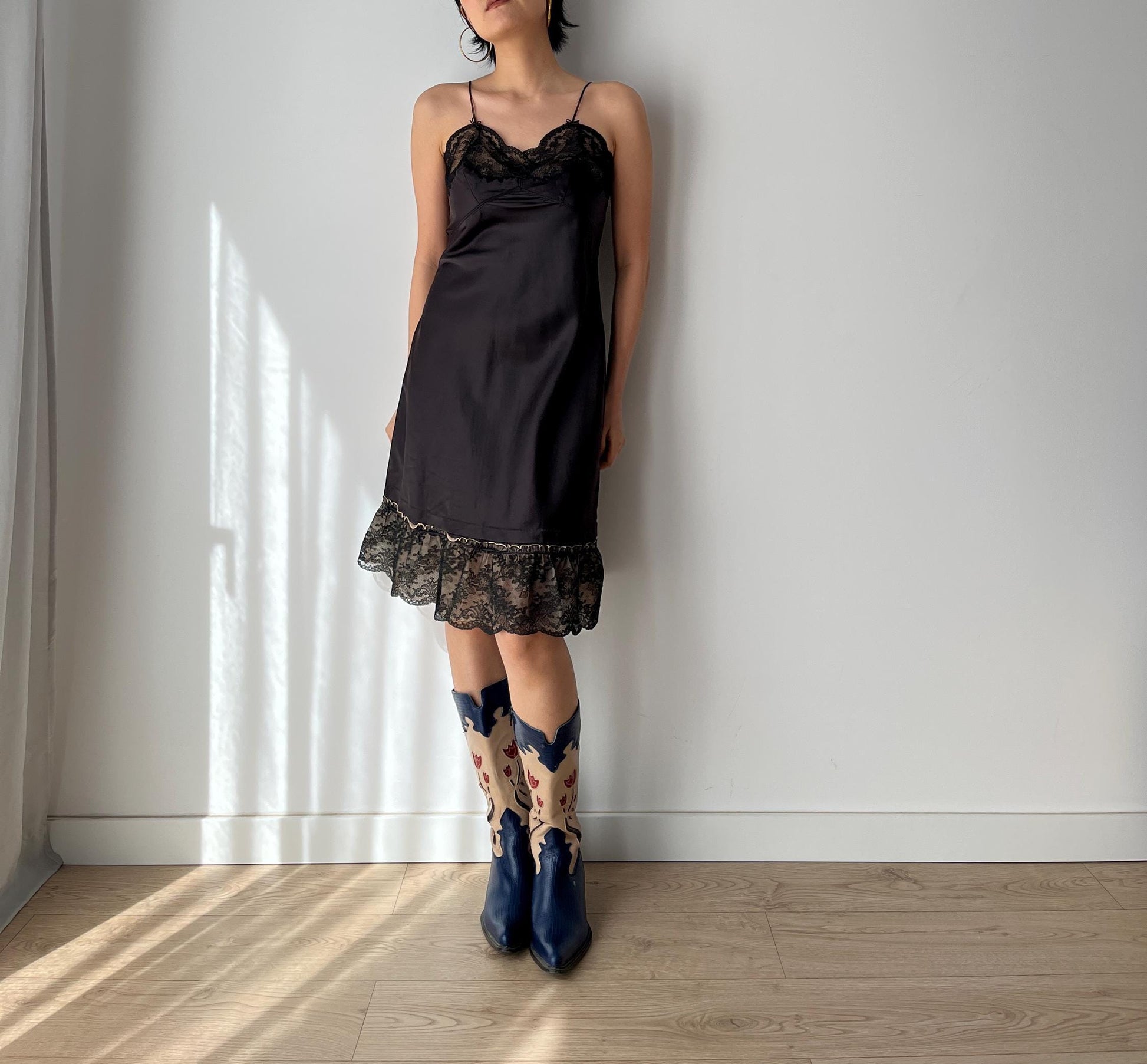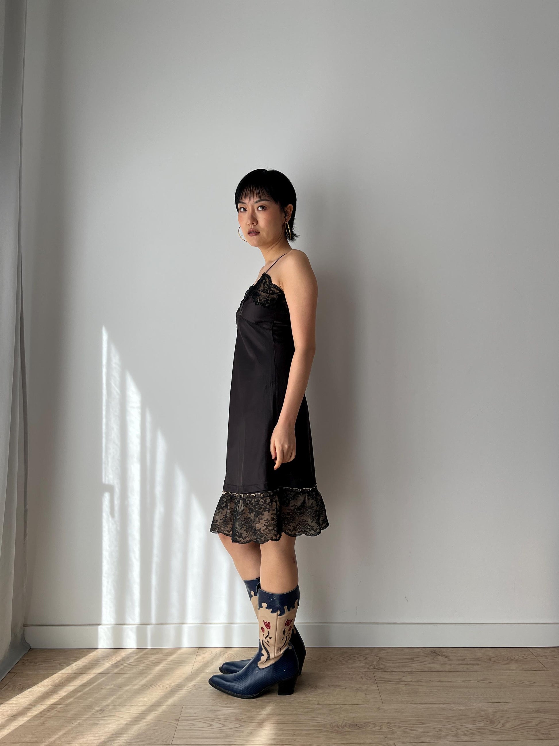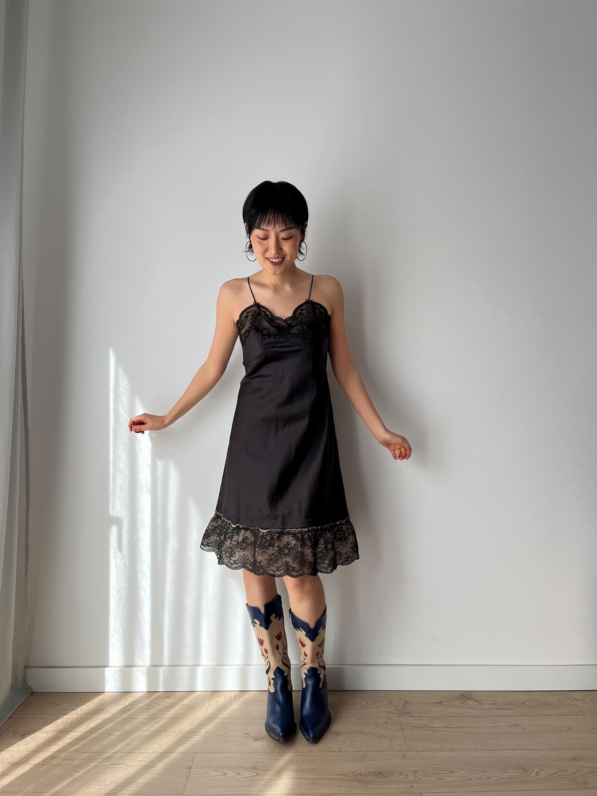 Antique Vintage black lace rayon nightgown mini lingerie under dress, she has thin straps, the bodice is decorated with beautiful hand floral lace