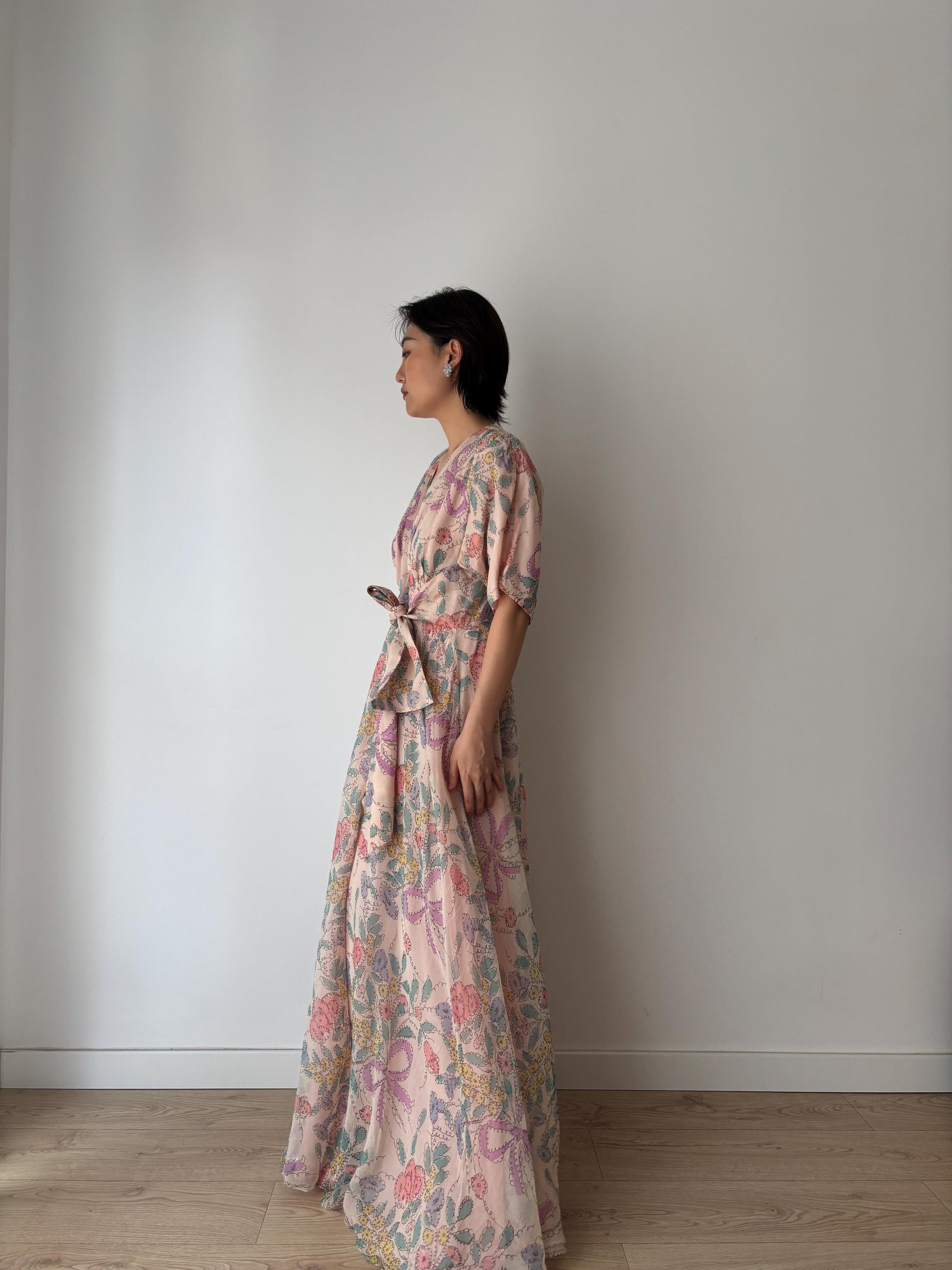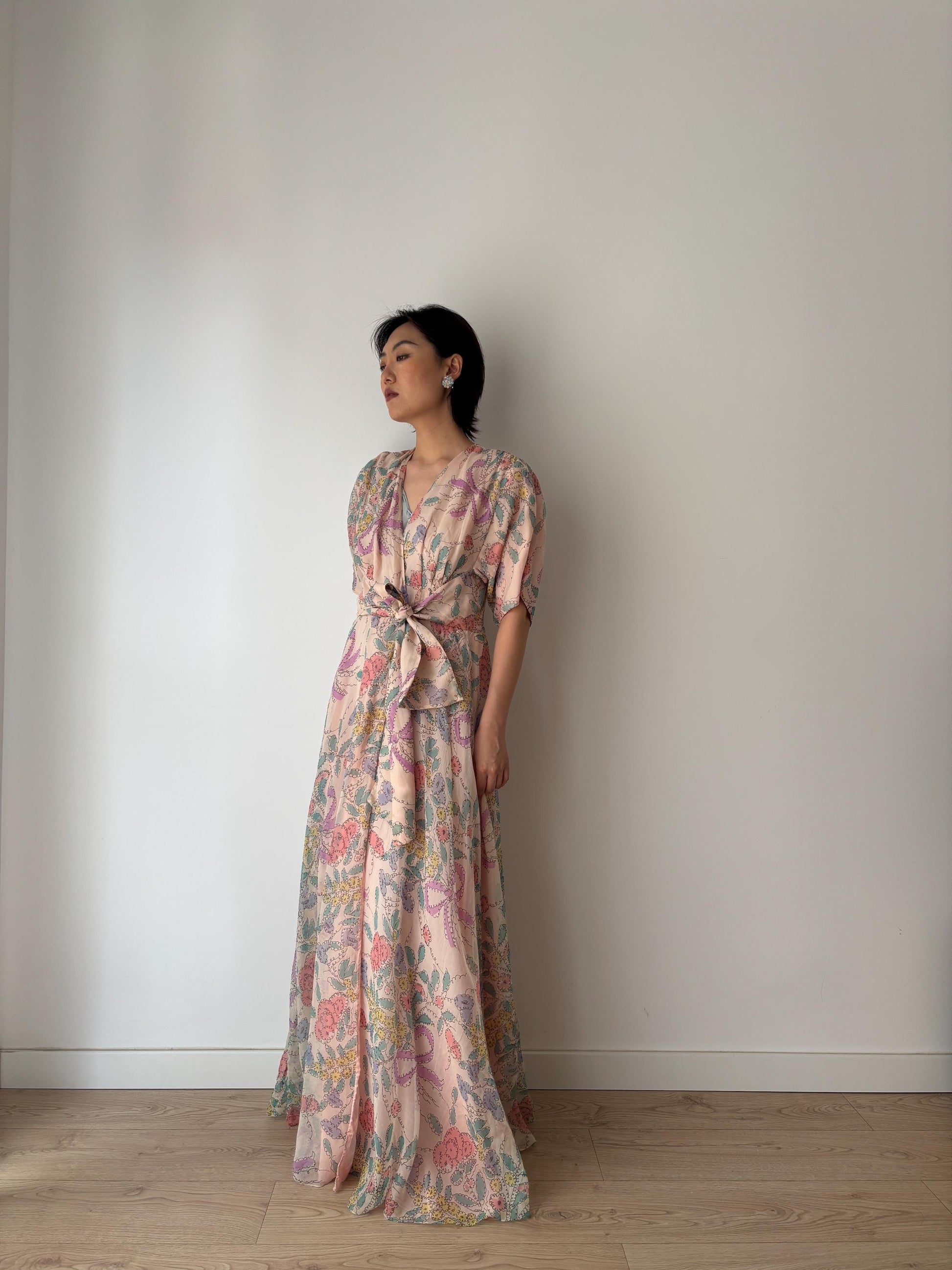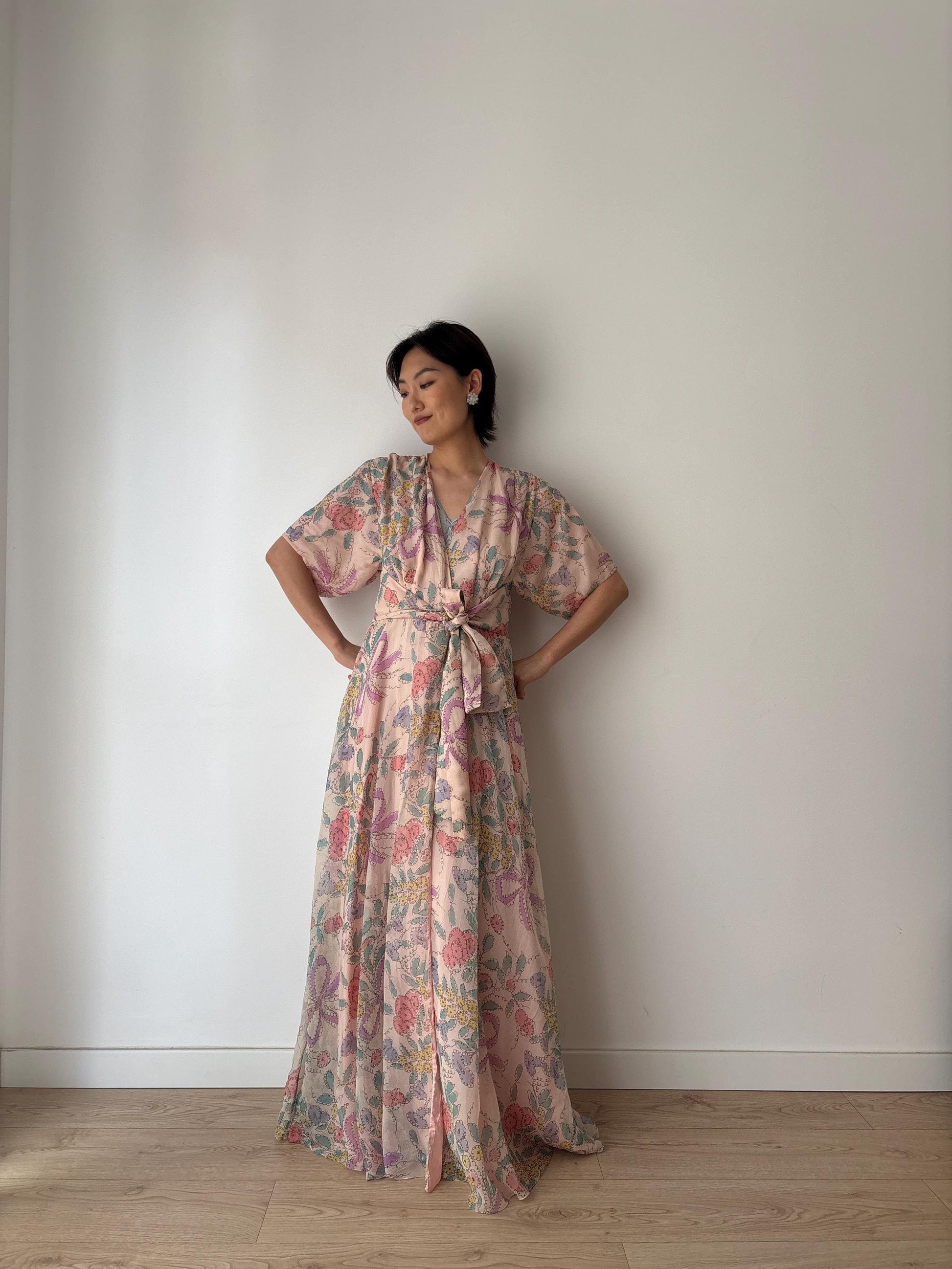 Rare 1920s 1930s Silk chiffon floral bow print dressing gown robe, Romantic shimmering pink silk Hollywood glam house coat