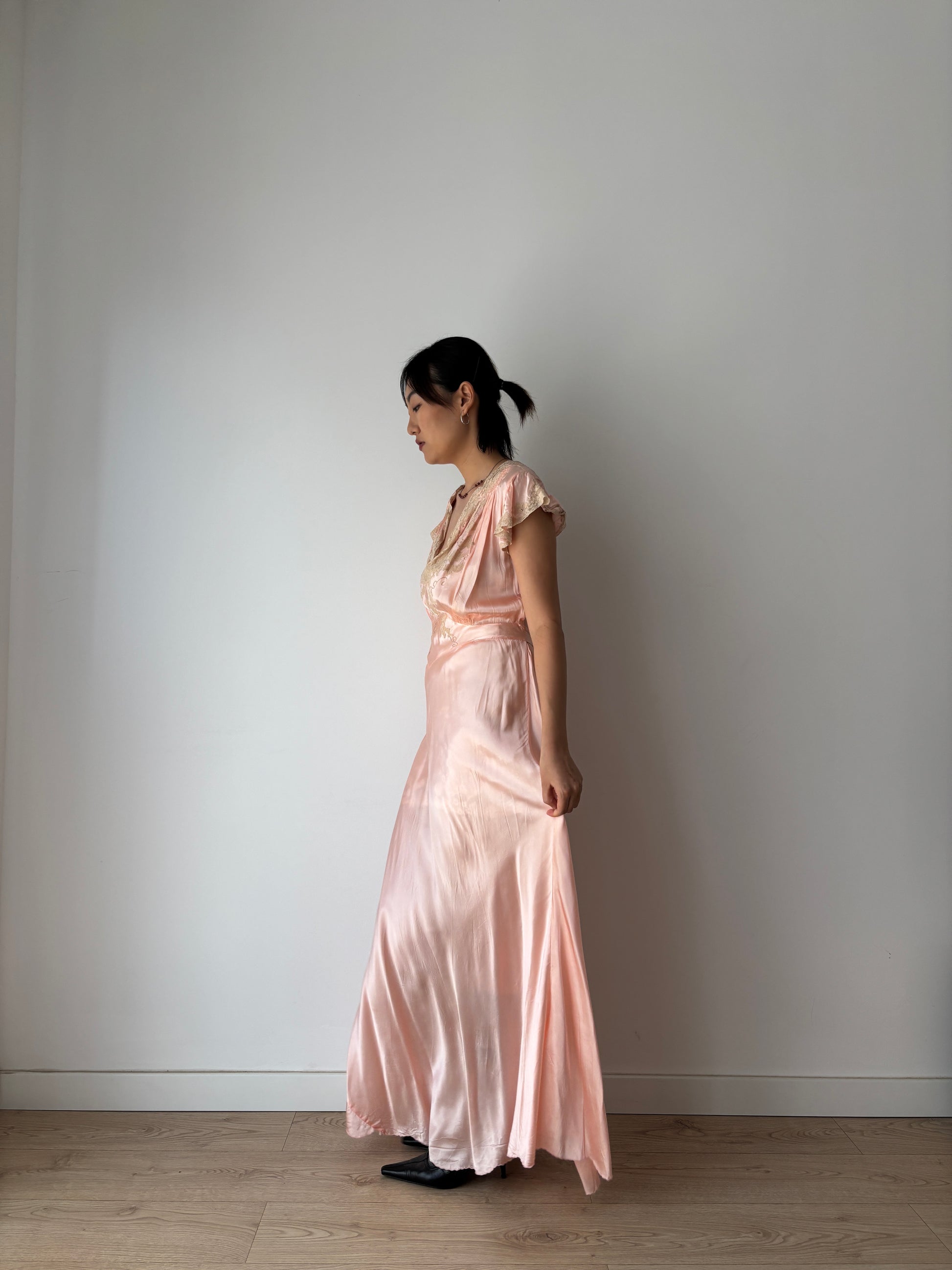 Rare 1930s 1940s Butterfly Sleeve Bias Cut Ruffle Lace Pastel Pink Silk Satin Dress