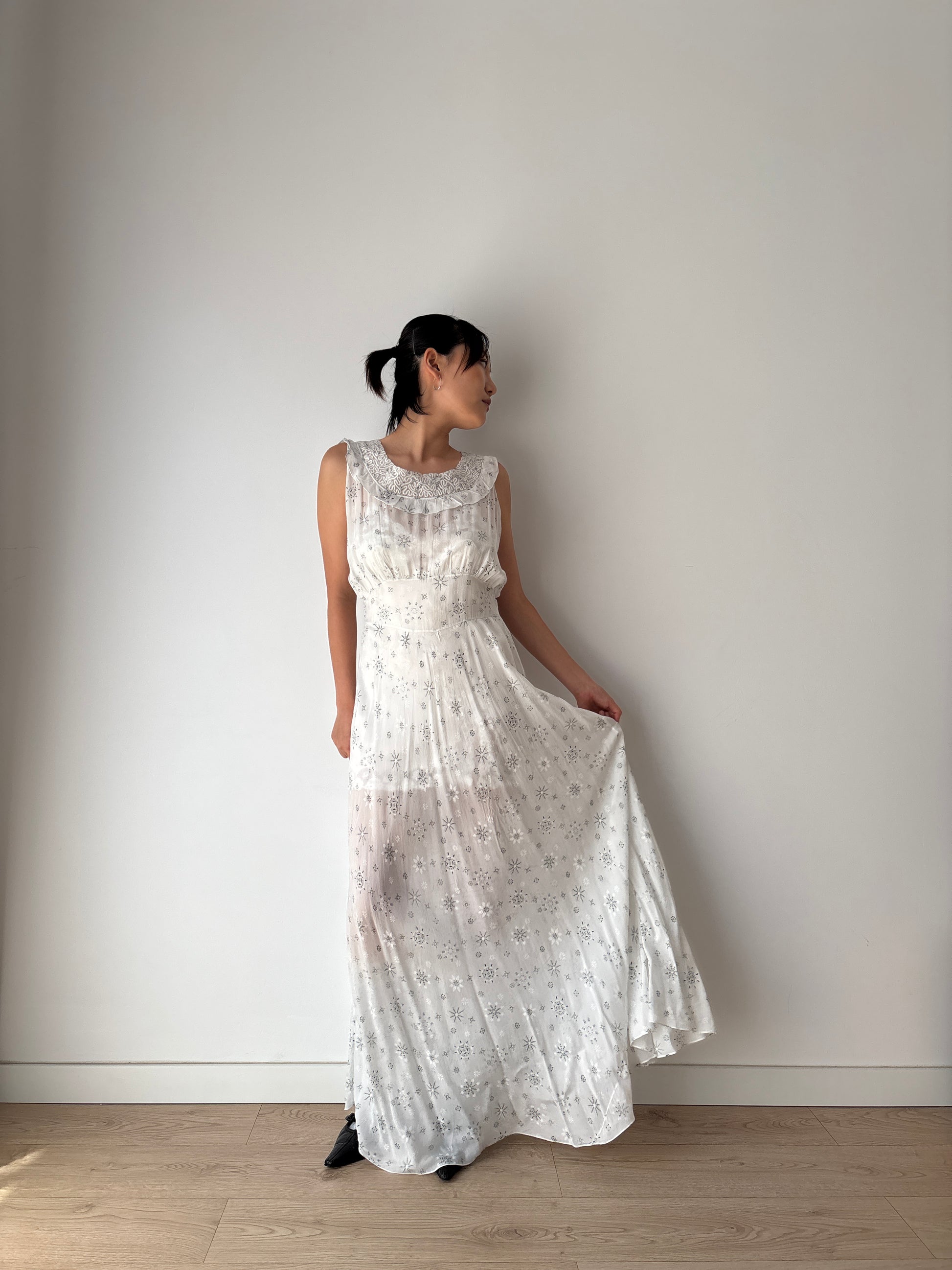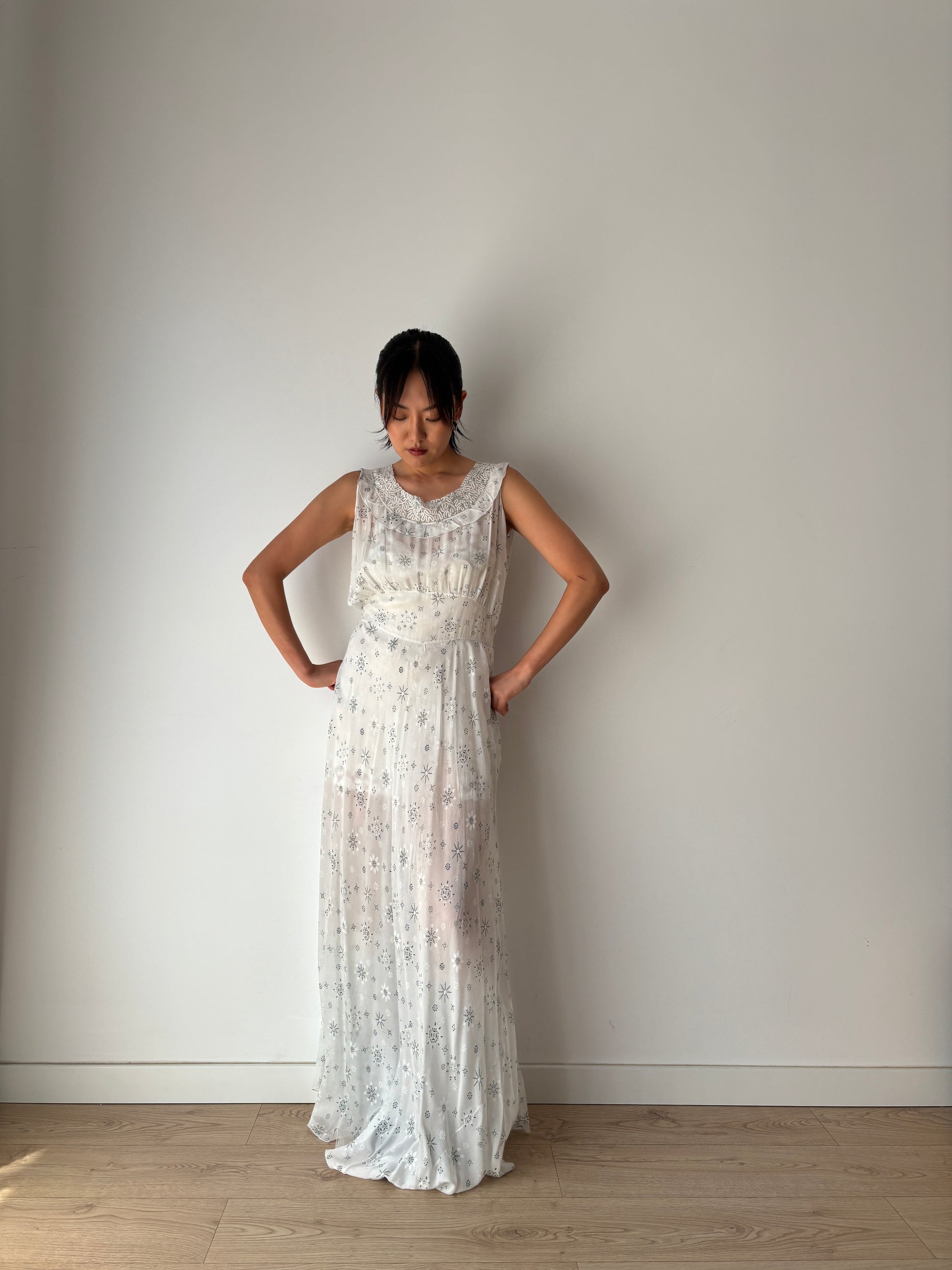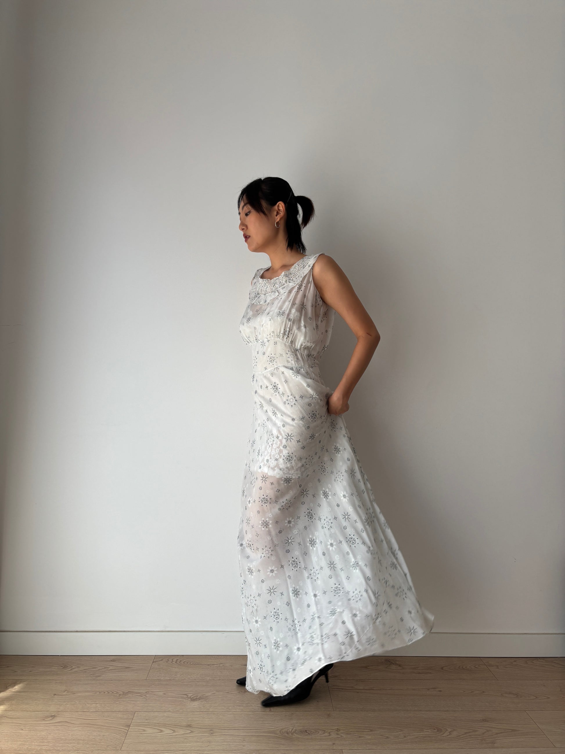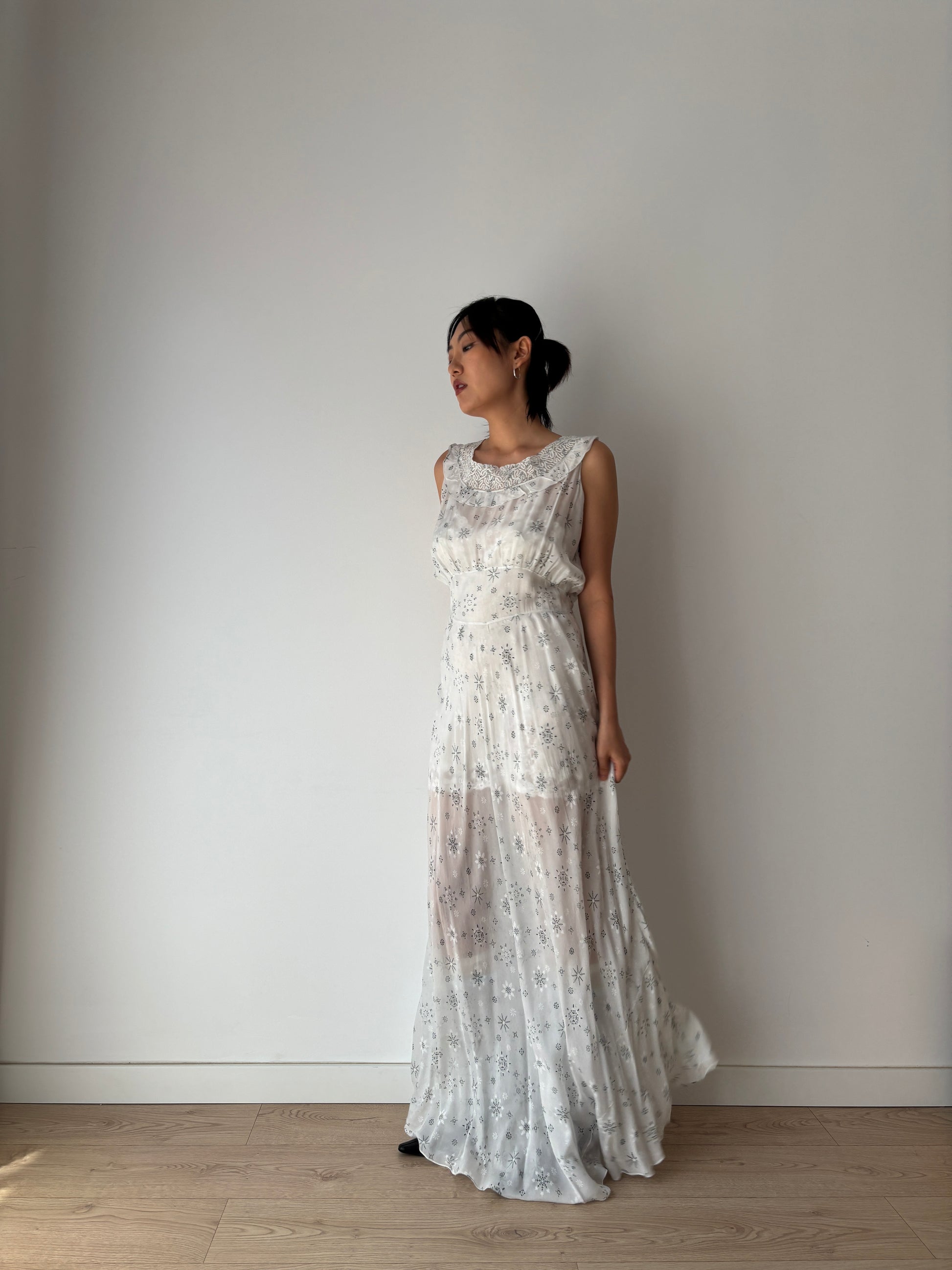 vintage 1940s blue print silk lace ribbon art deco style bias cut dress