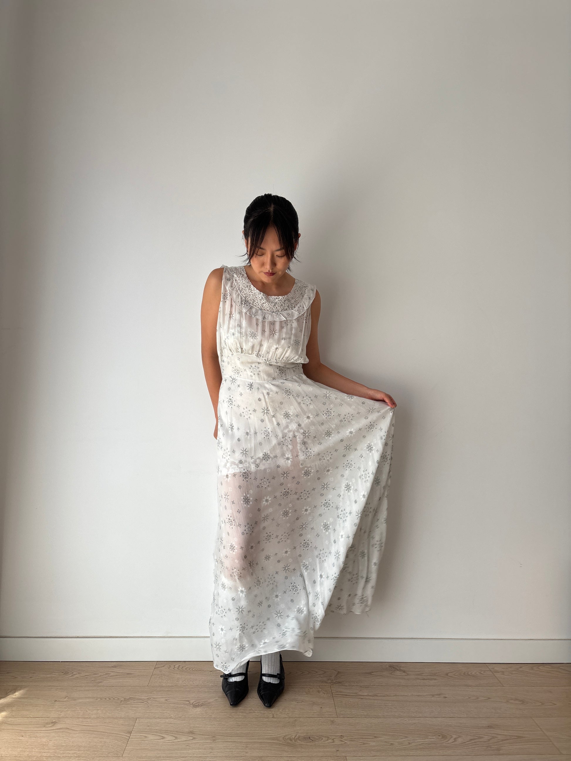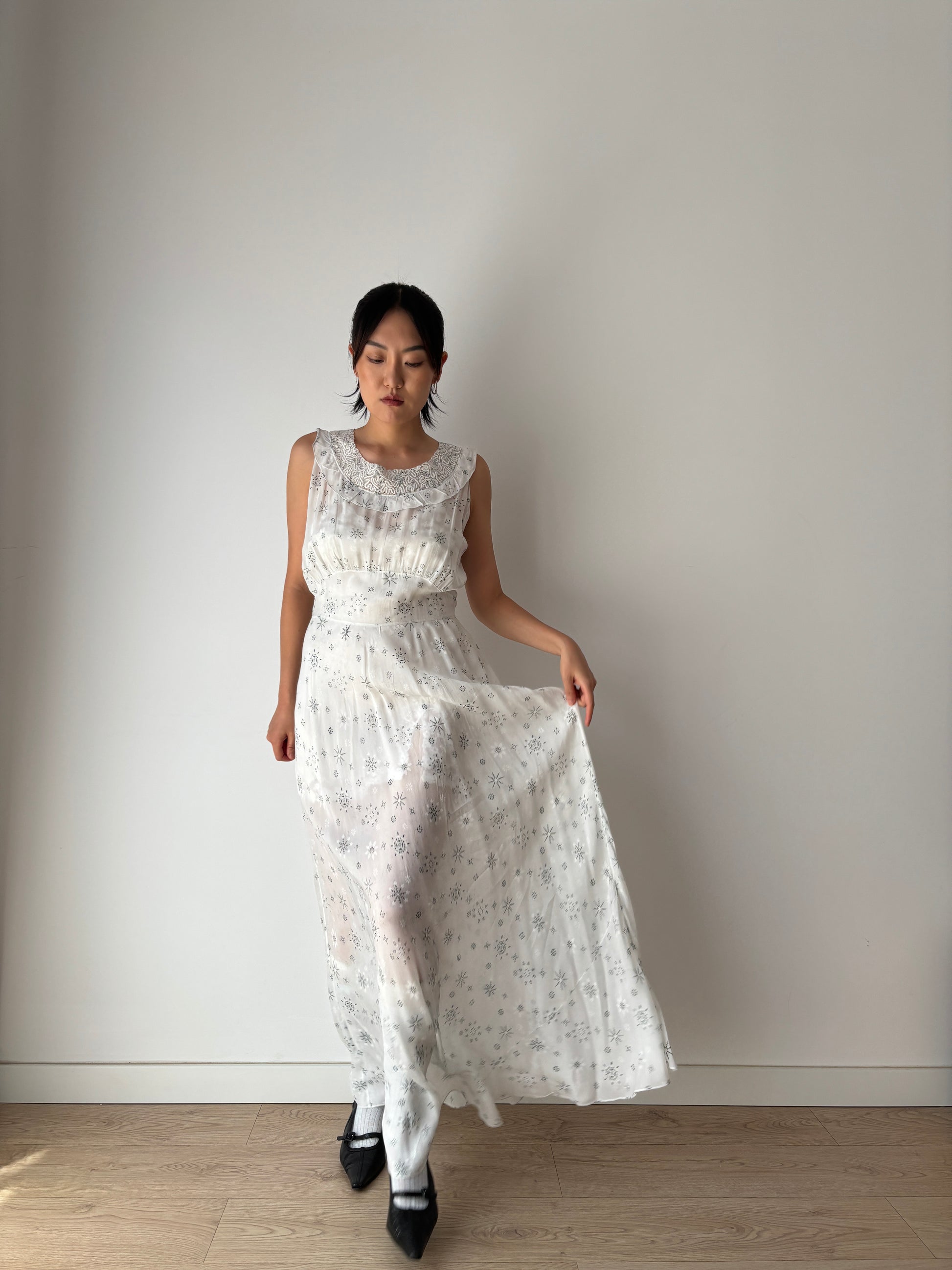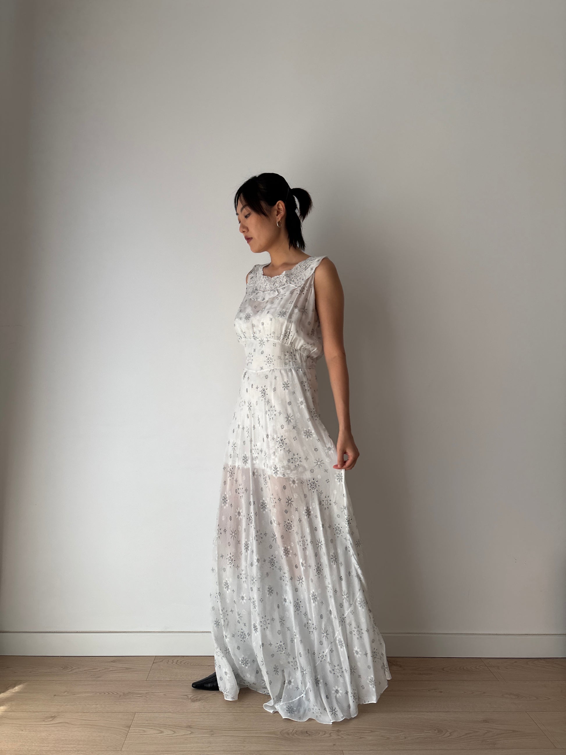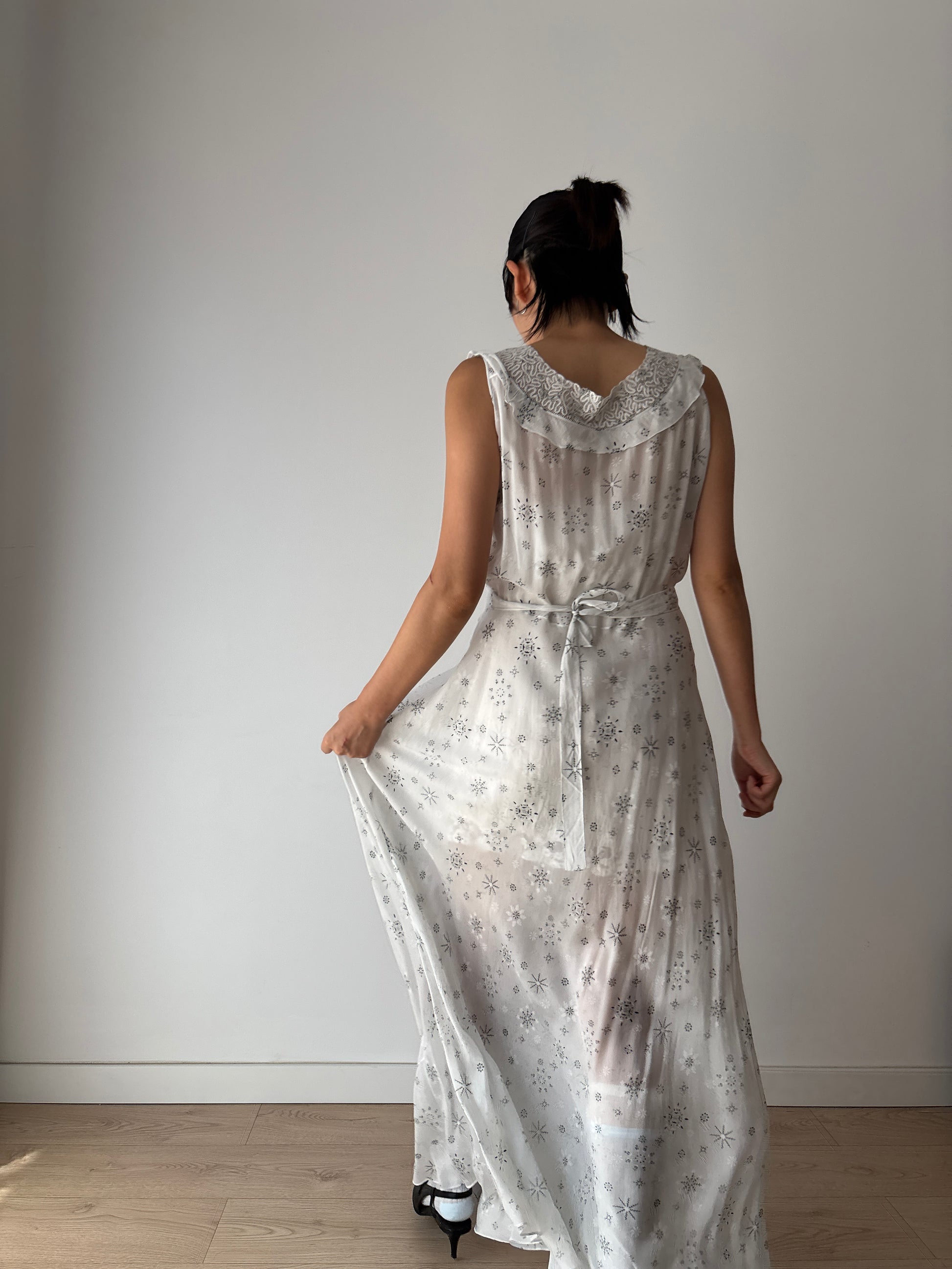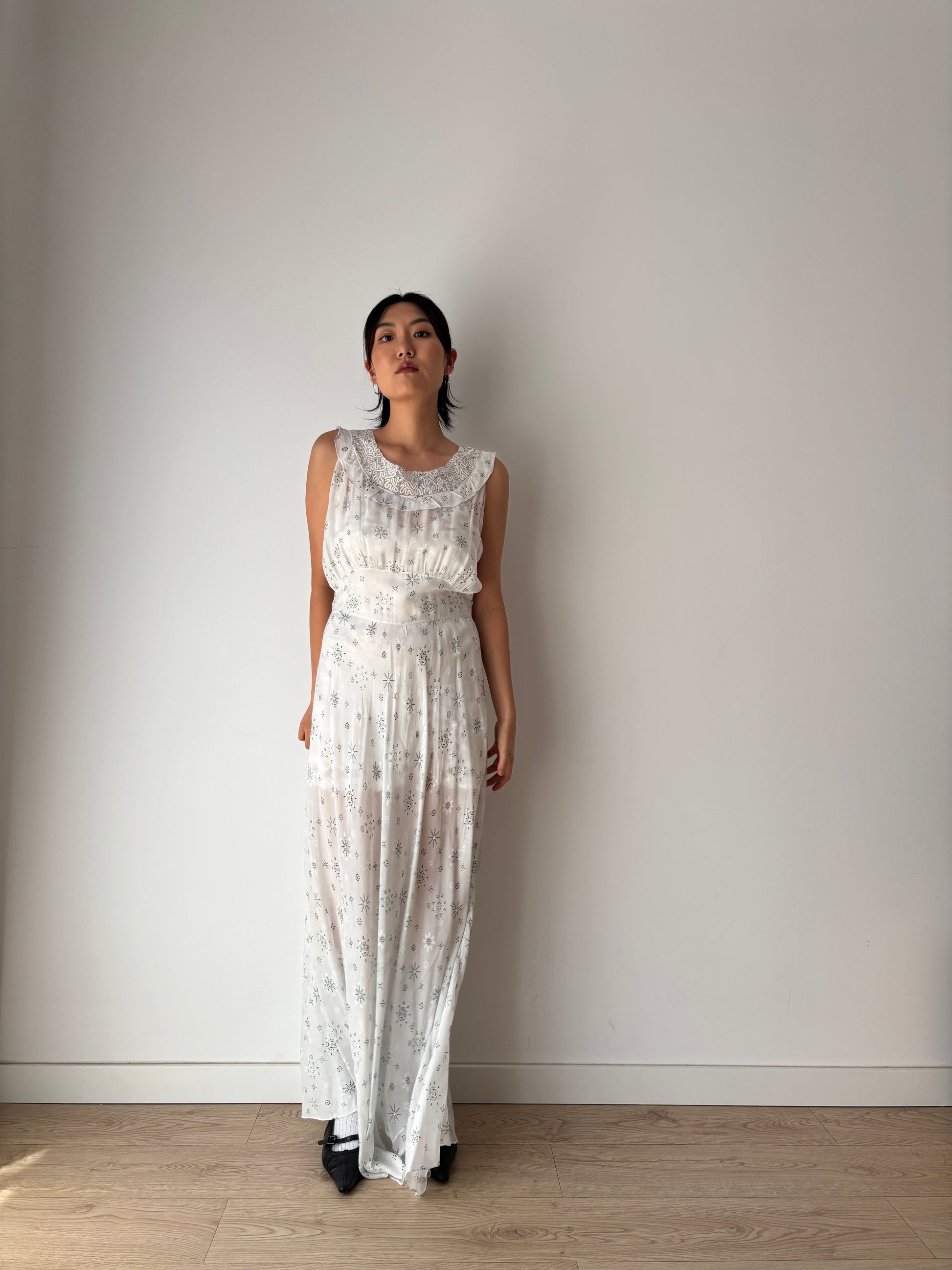 vintage 1940s blue print silk lace ribbon art deco style bias cut dress