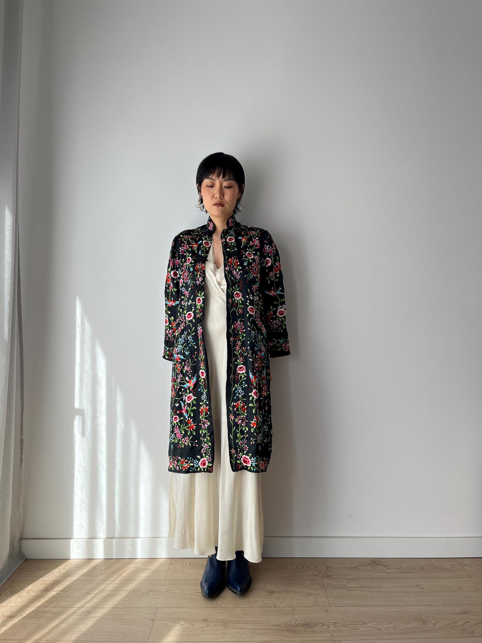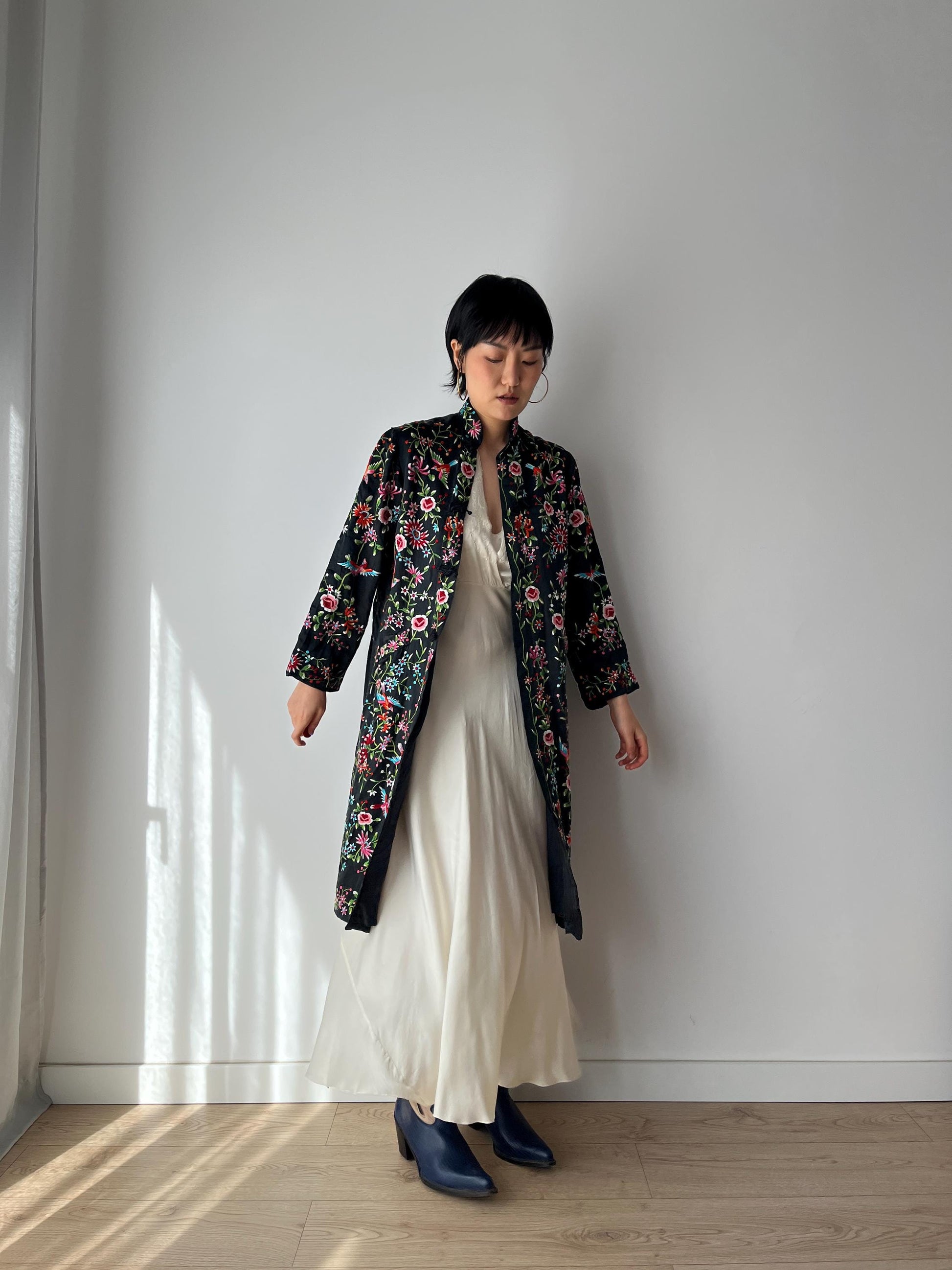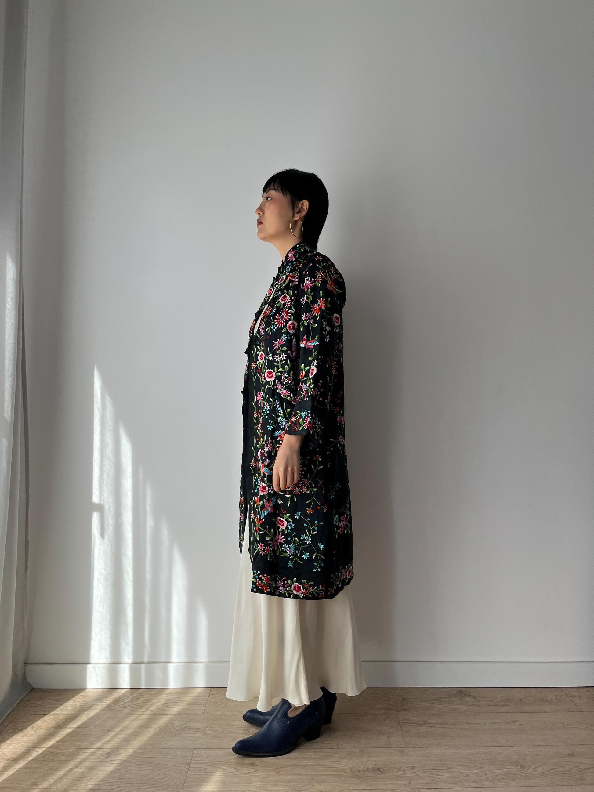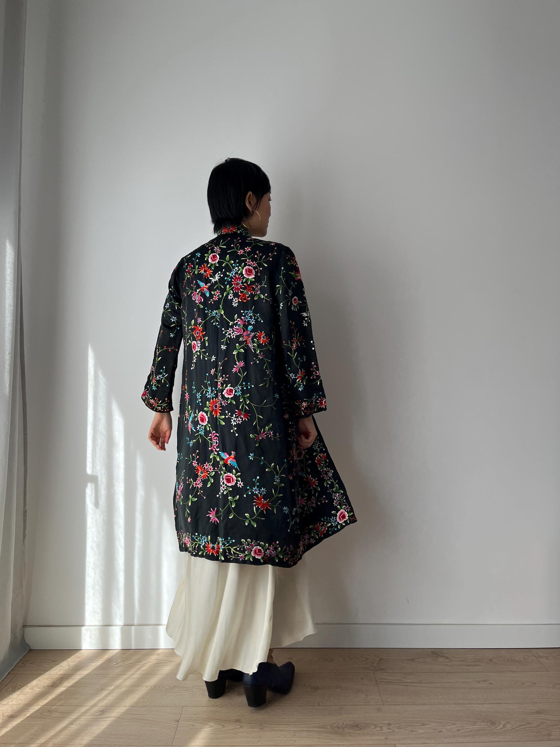 Vintage 1940s Chinese Silk Rayon Flower Hand Embroidered Cheongsam Pajama Jacket