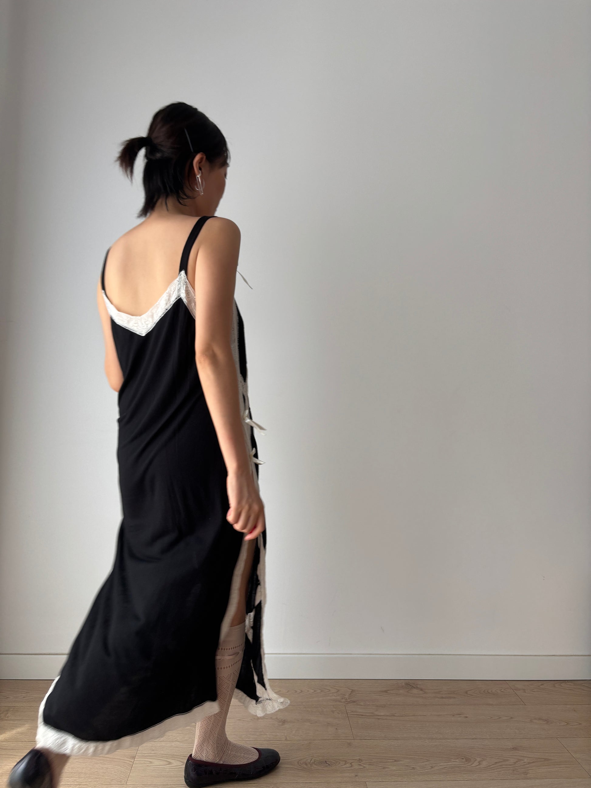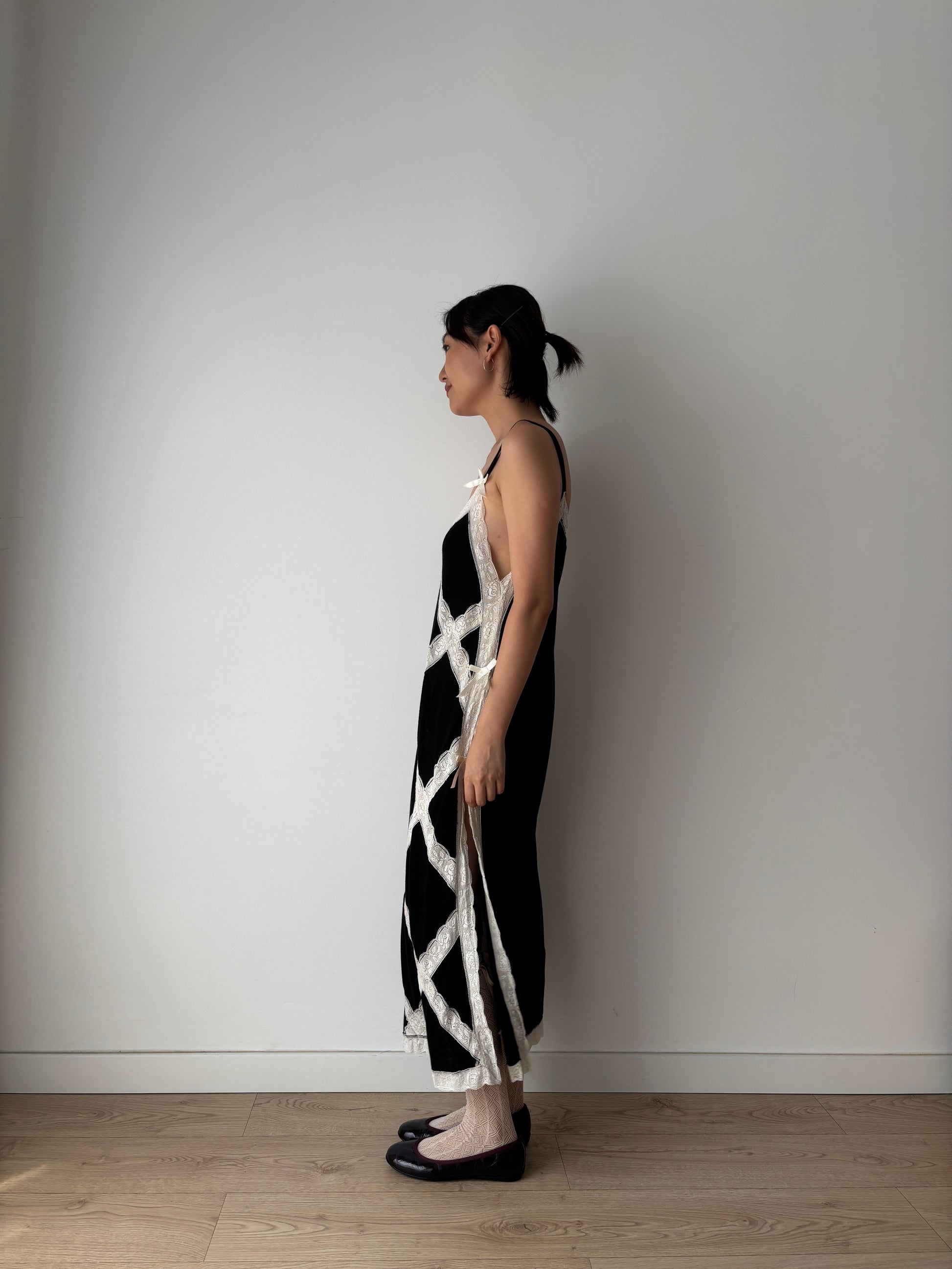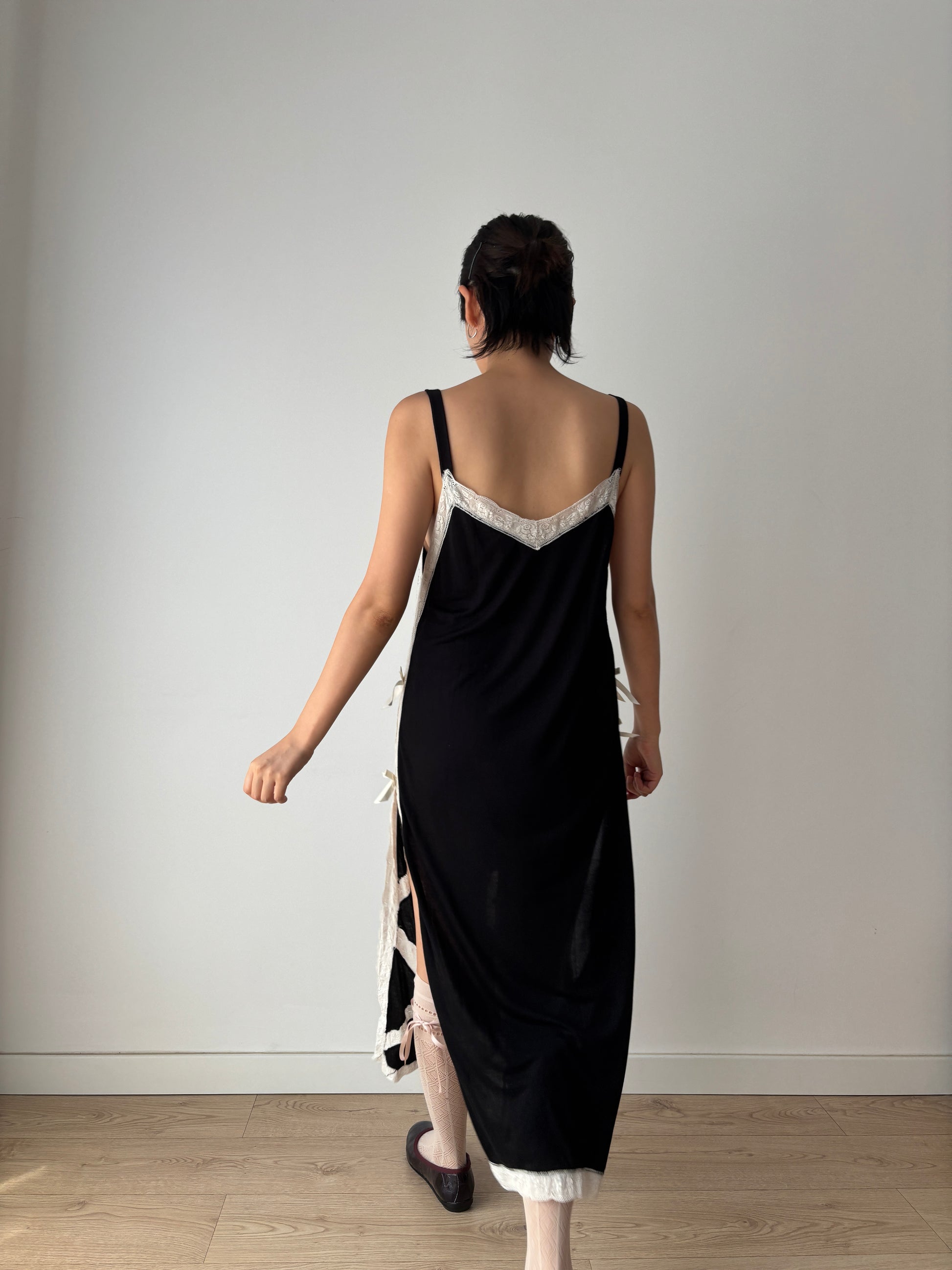 Vintage 90s Chic Y2K black cotton lace bow straight cut nightgown maxi slip dress