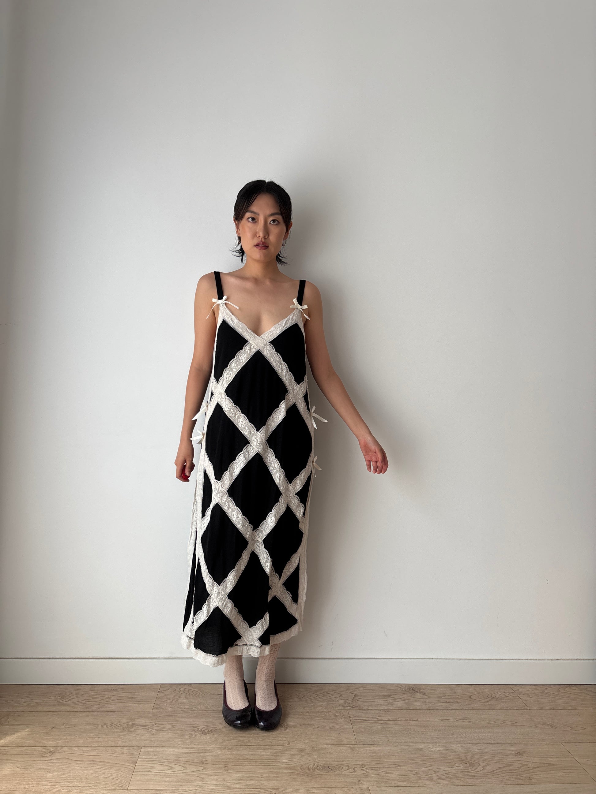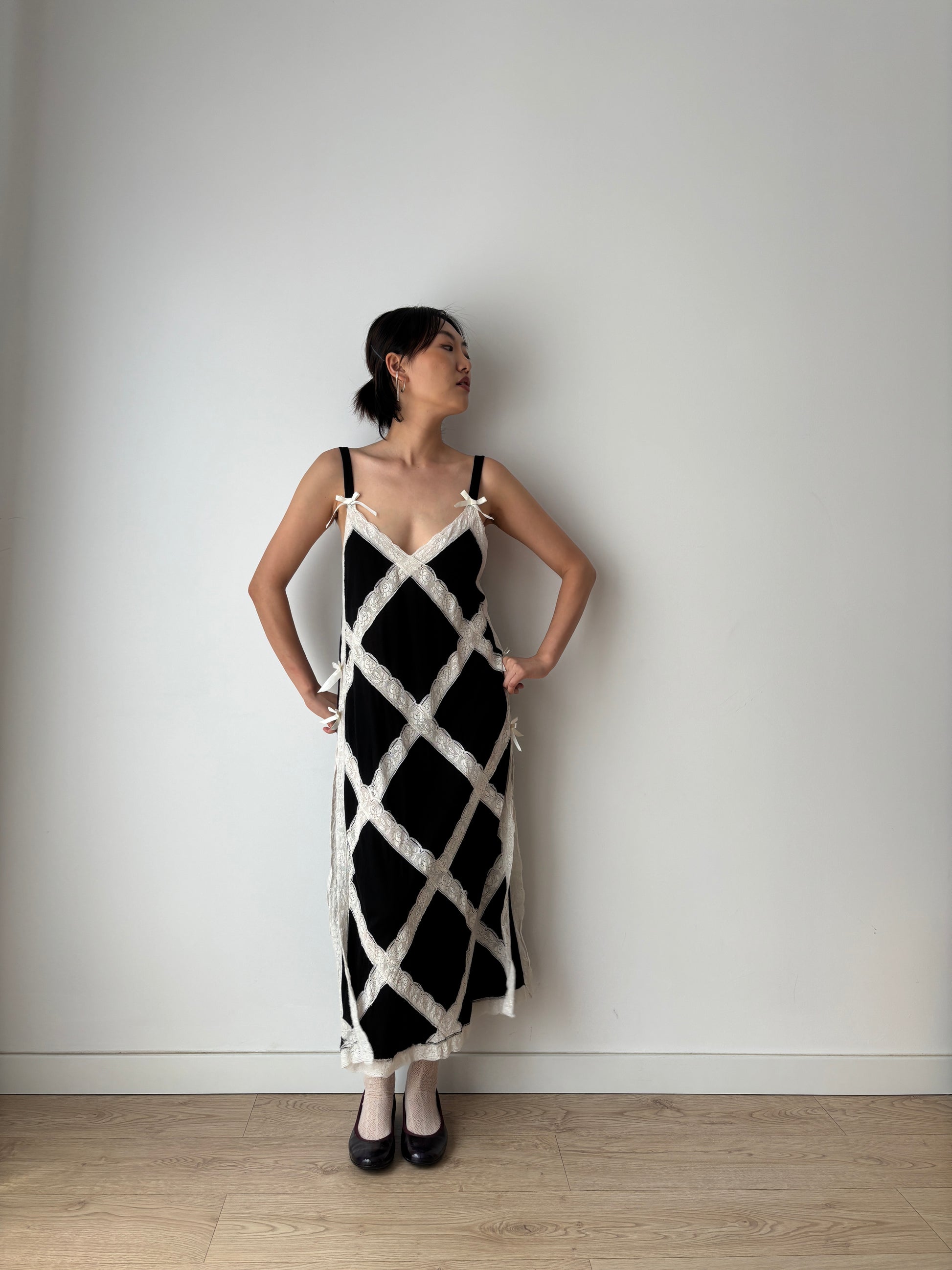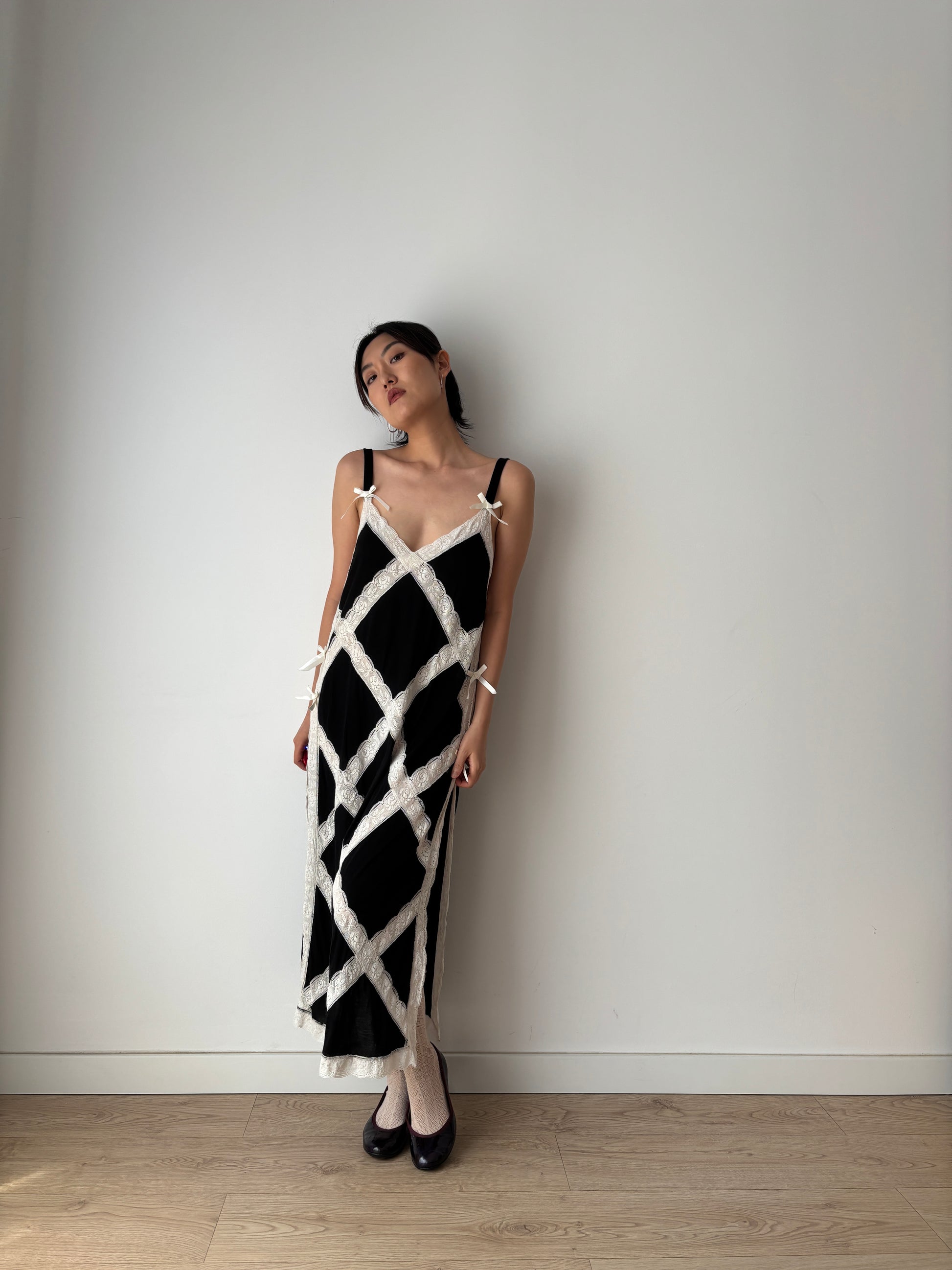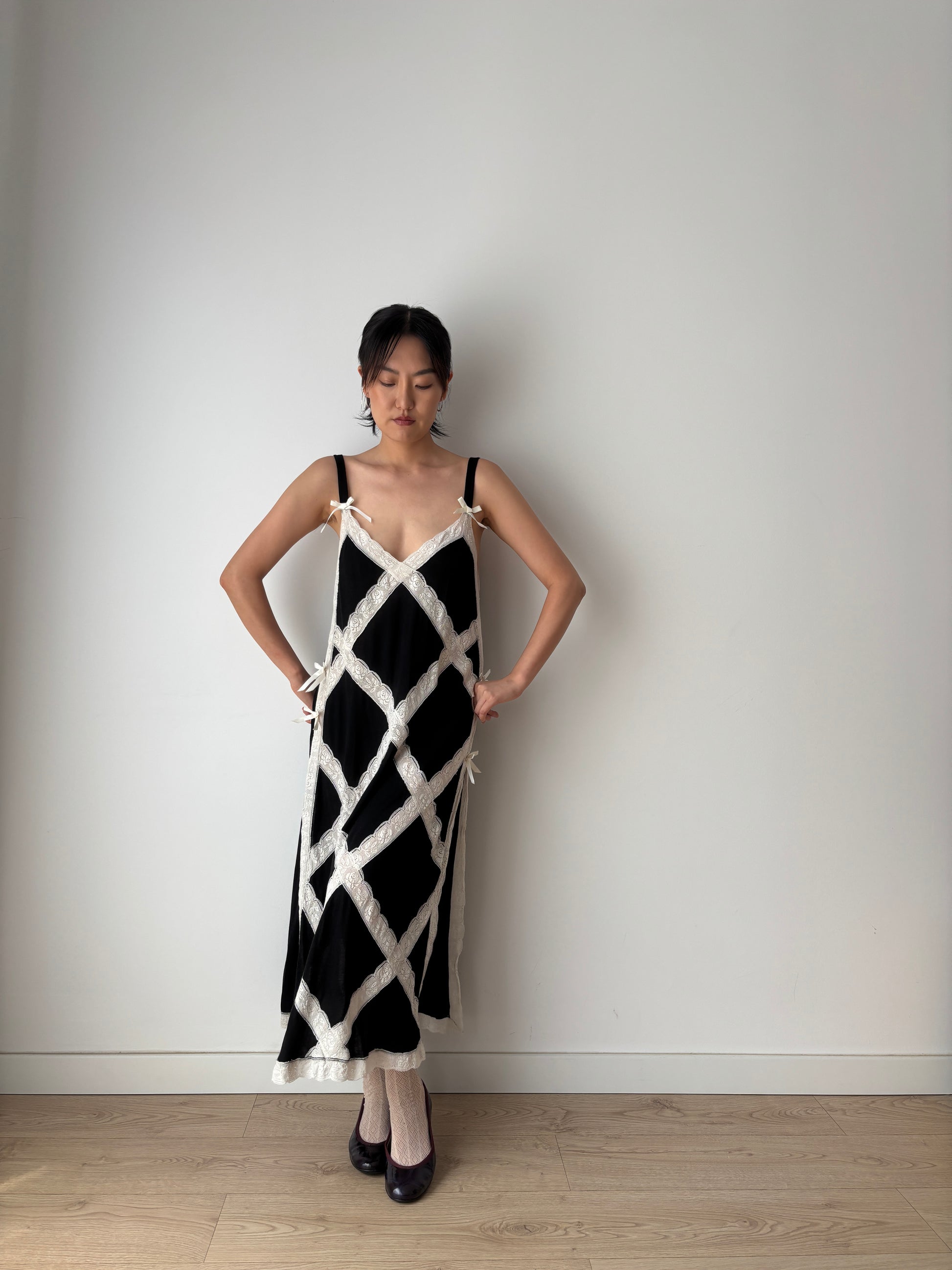 Vintage 90s Chic Y2K black cotton lace bow straight cut nightgown maxi slip dress