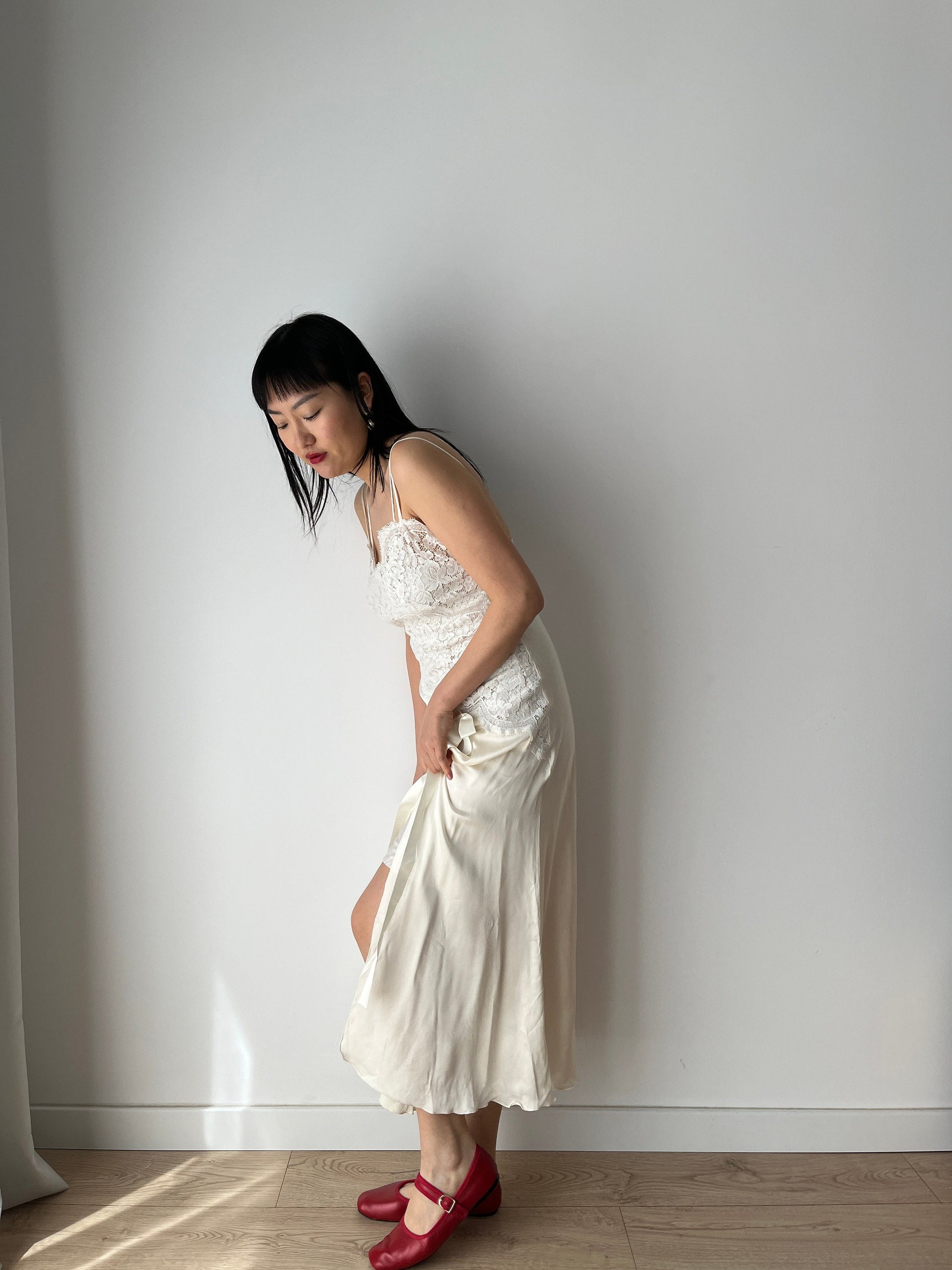 Vintage liquid silk lace satin backless white slip long maxi camisole dress, you can wear it as a summer silk slip dress or night party dress.