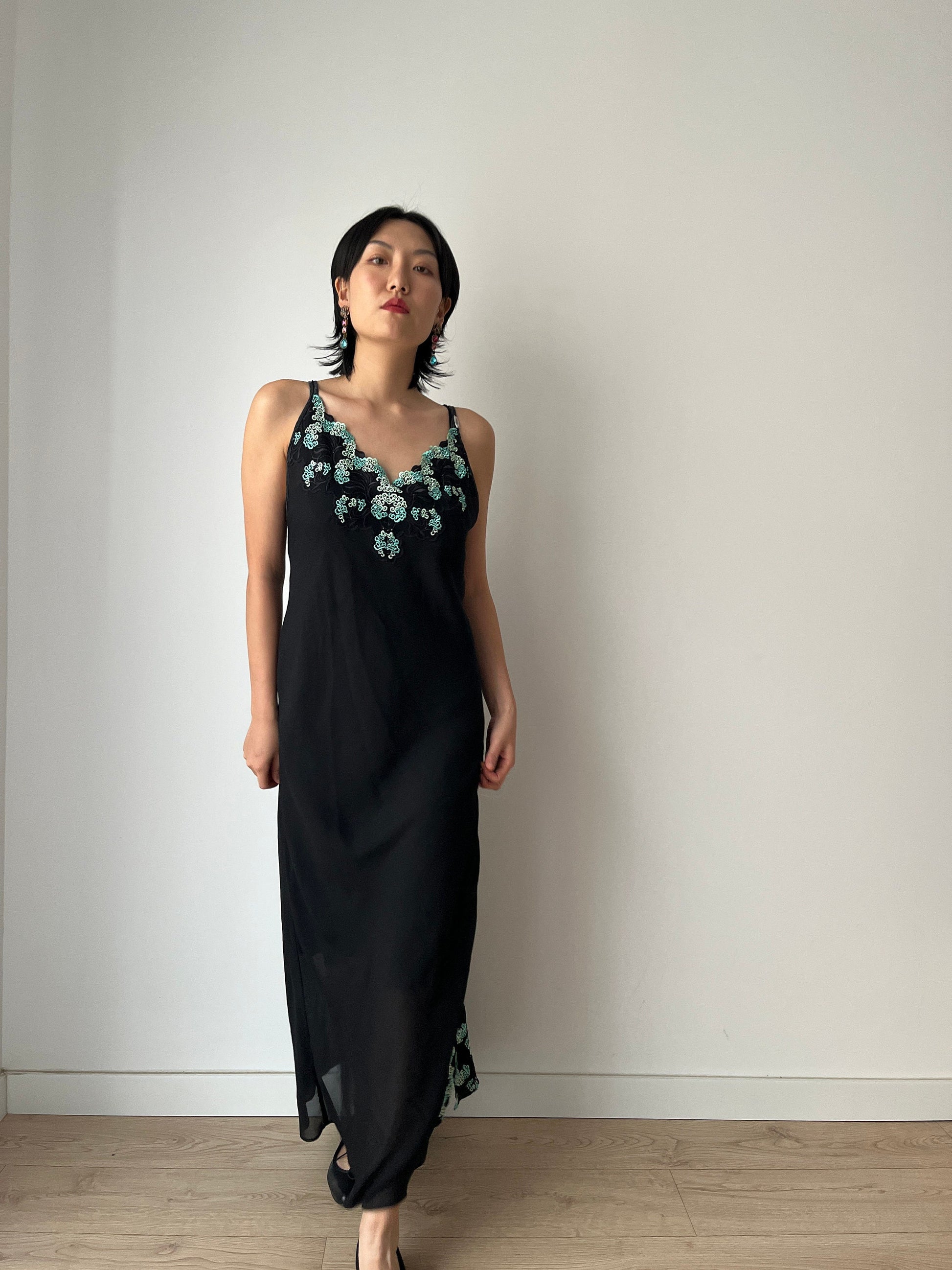 Vintage black pure silk chiffon lace cut out embroidered nightdress