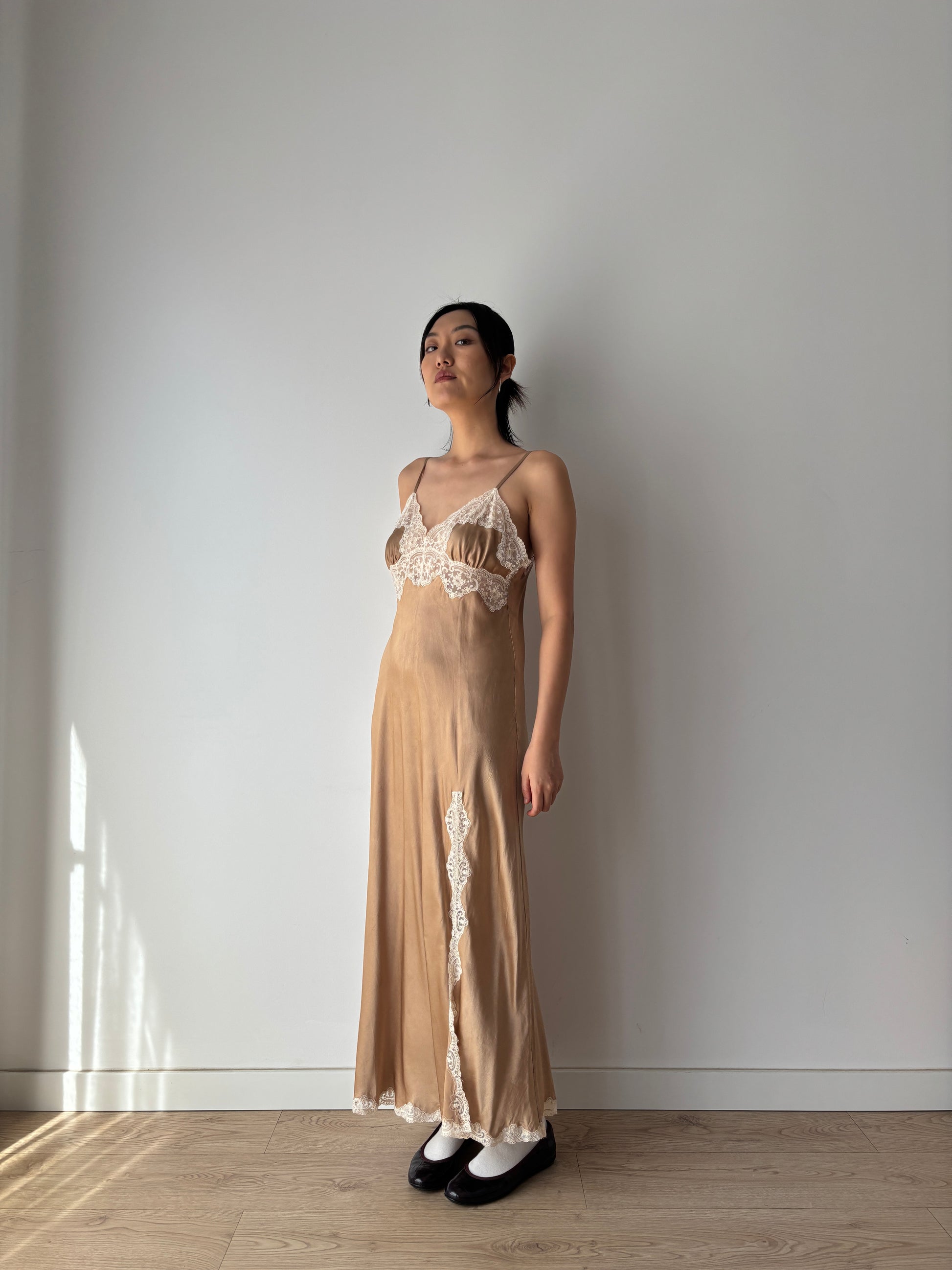 Vintage Brown Silk Lace Slip Dress with Appliqué, 1930s Style Romantic Slit Cut Maxi Gown
