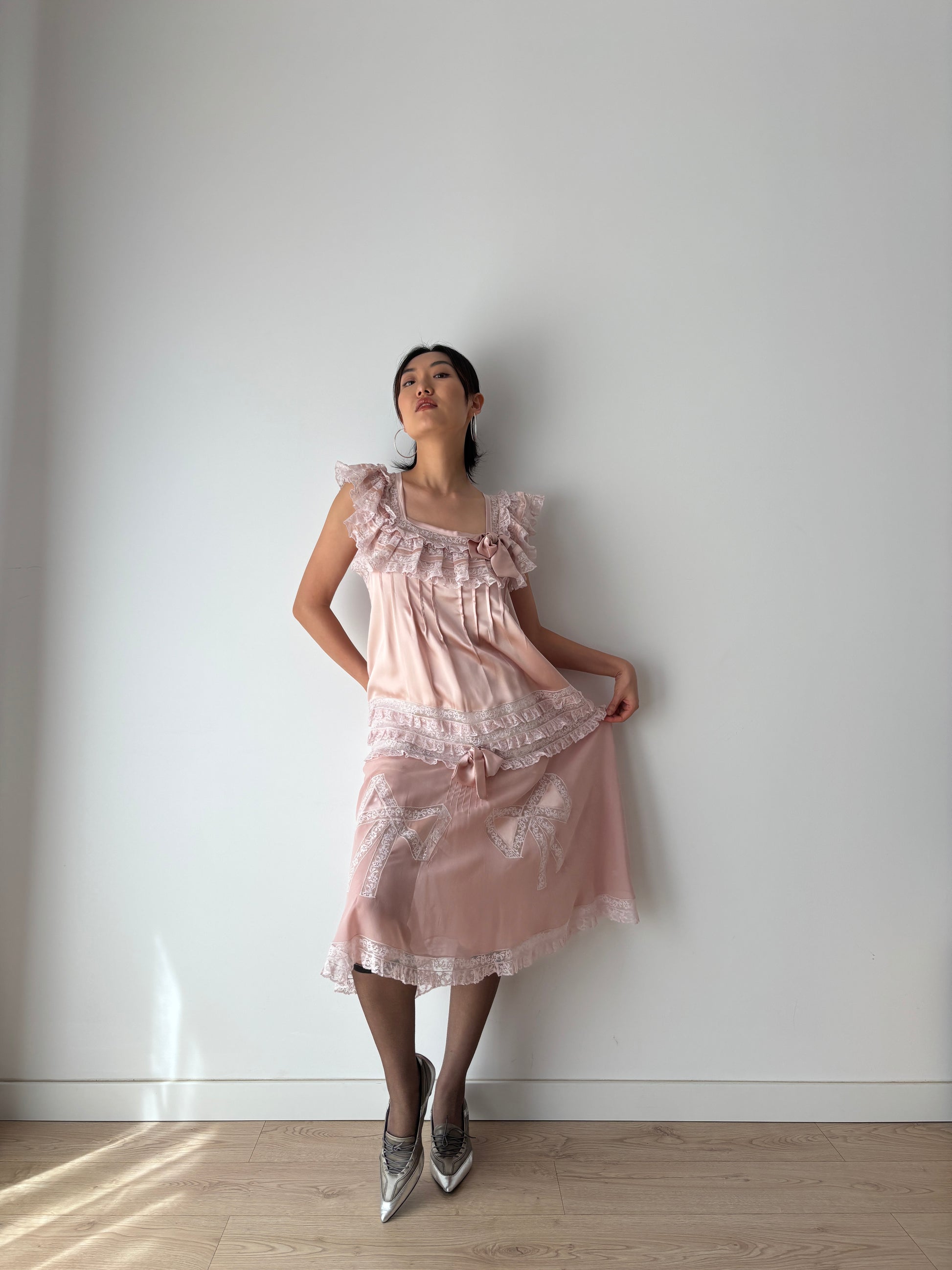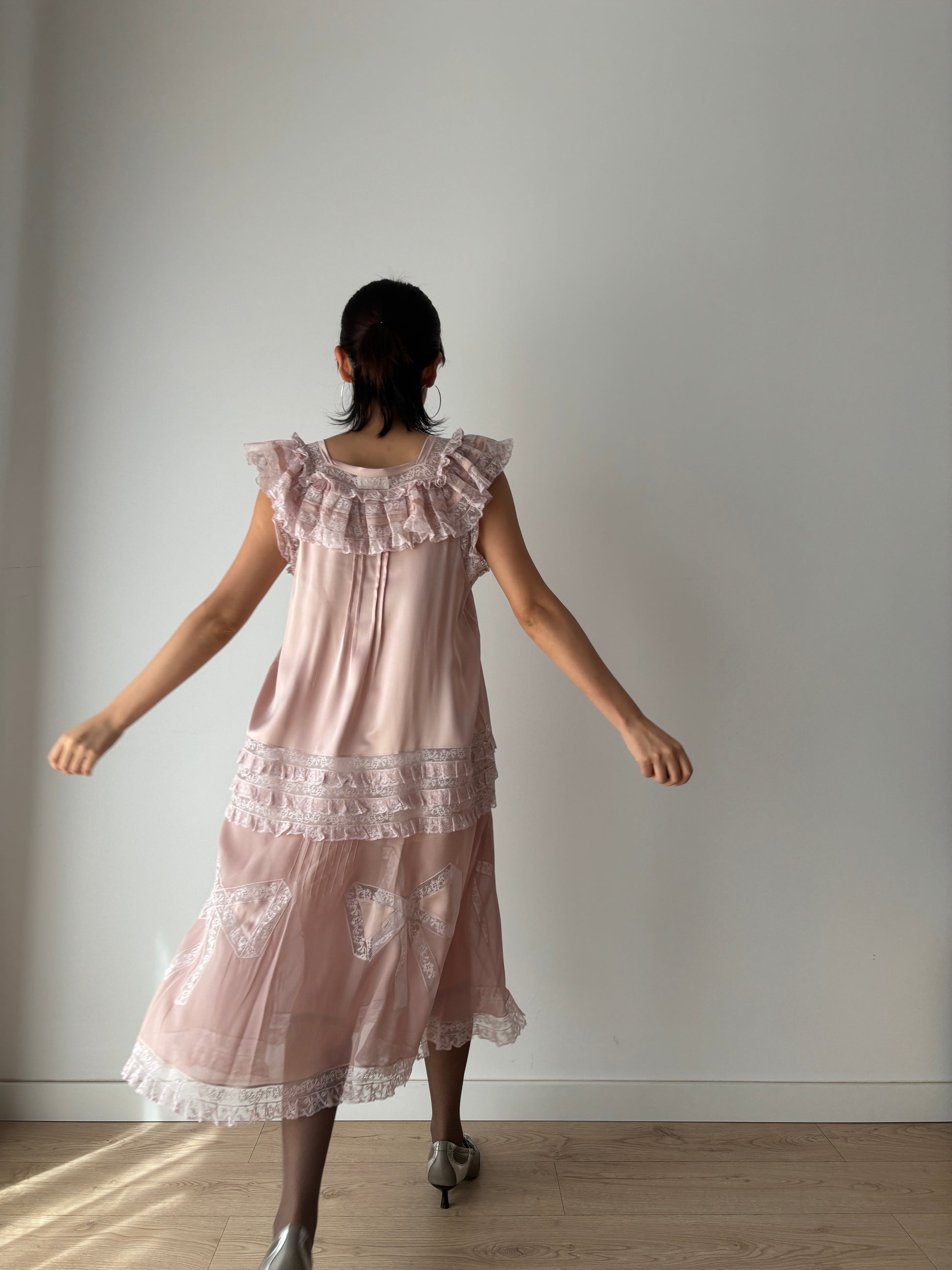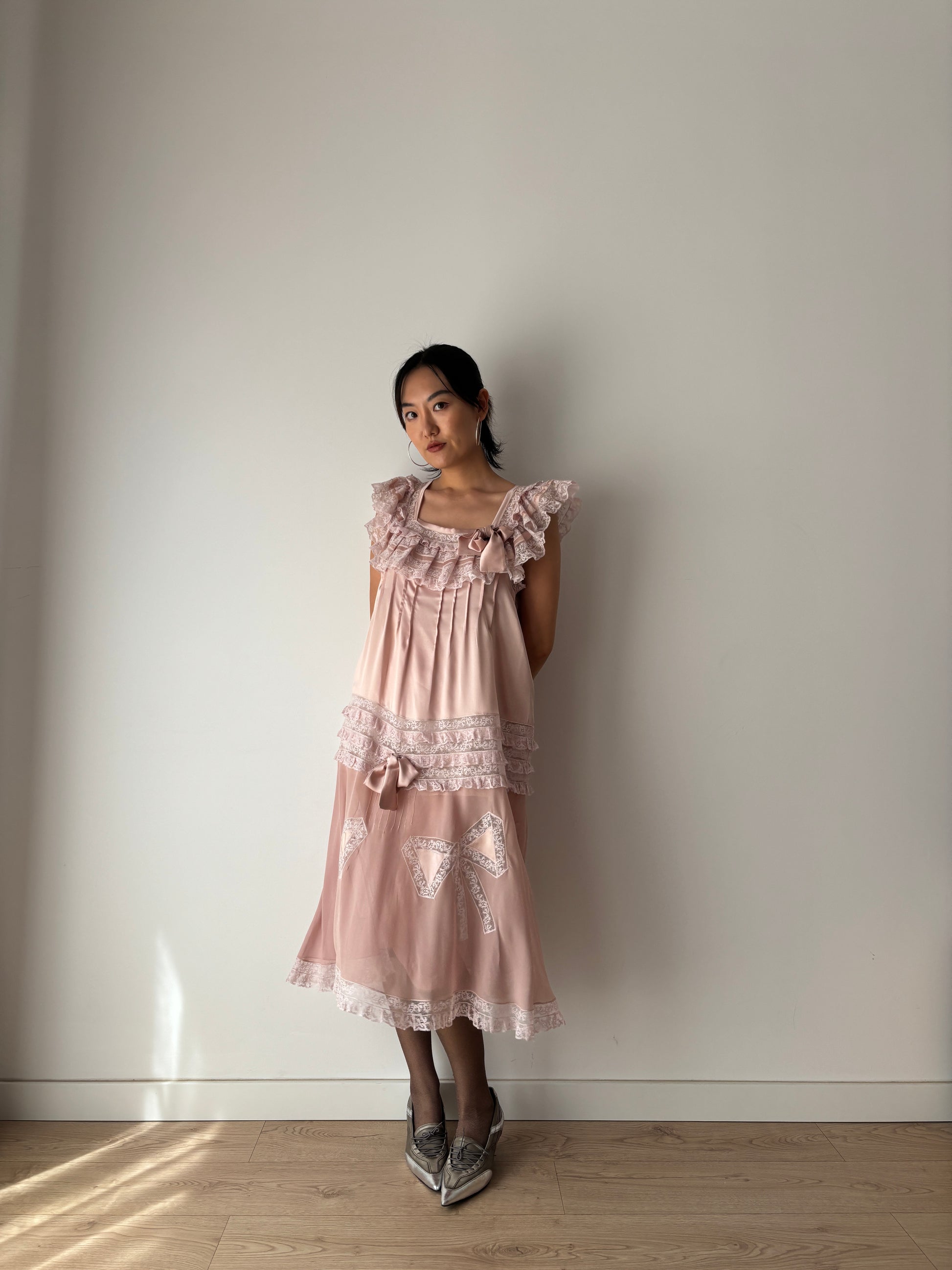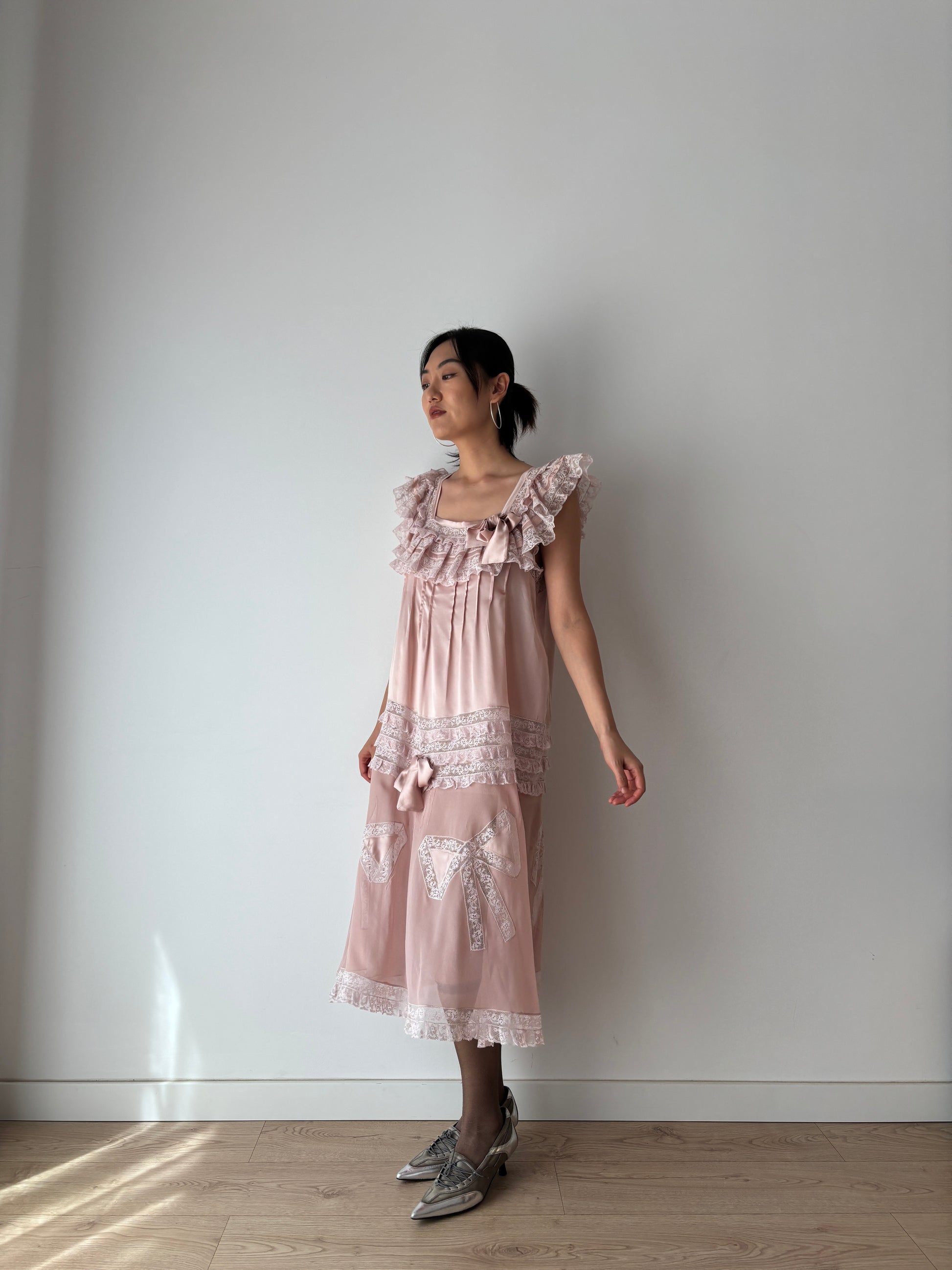 Vintage Purple Pink Pure Silk Heavy Lace Nightgown Lingerie Dress With Cute Bow Embroidery All Over