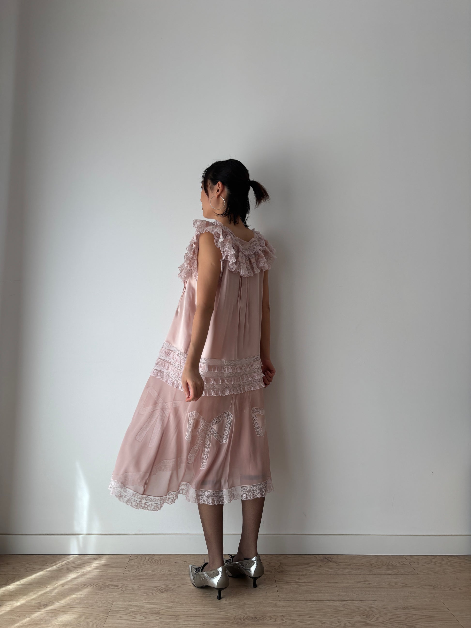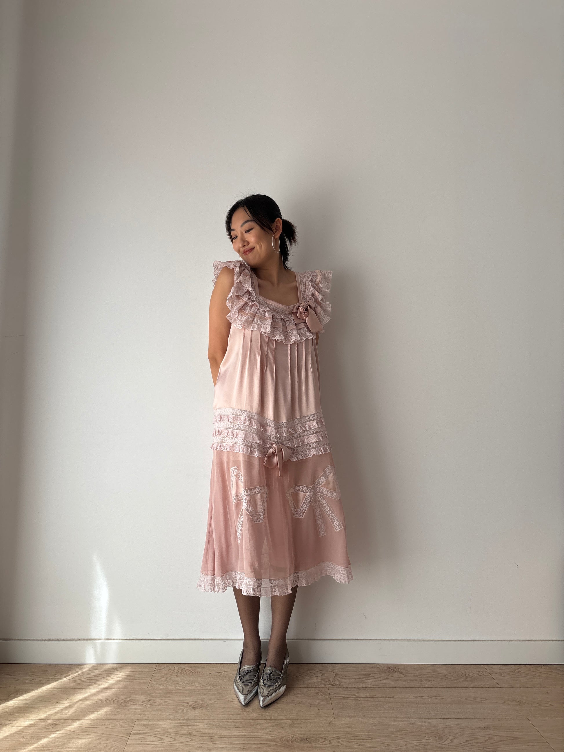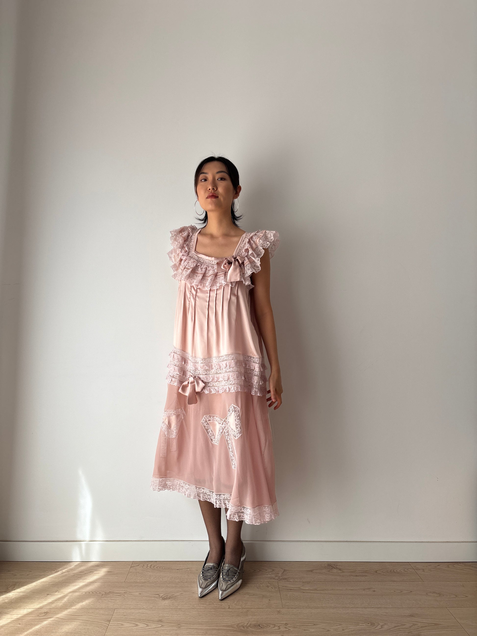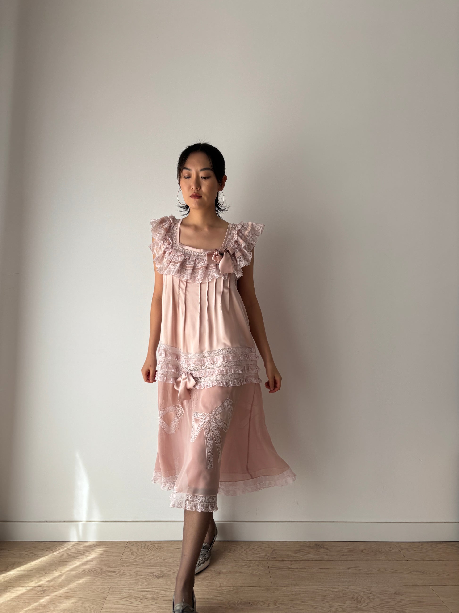 Vintage Purple Pink Pure Silk Heavy Lace Nightgown Lingerie Dress With Cute Bow Embroidery All Over