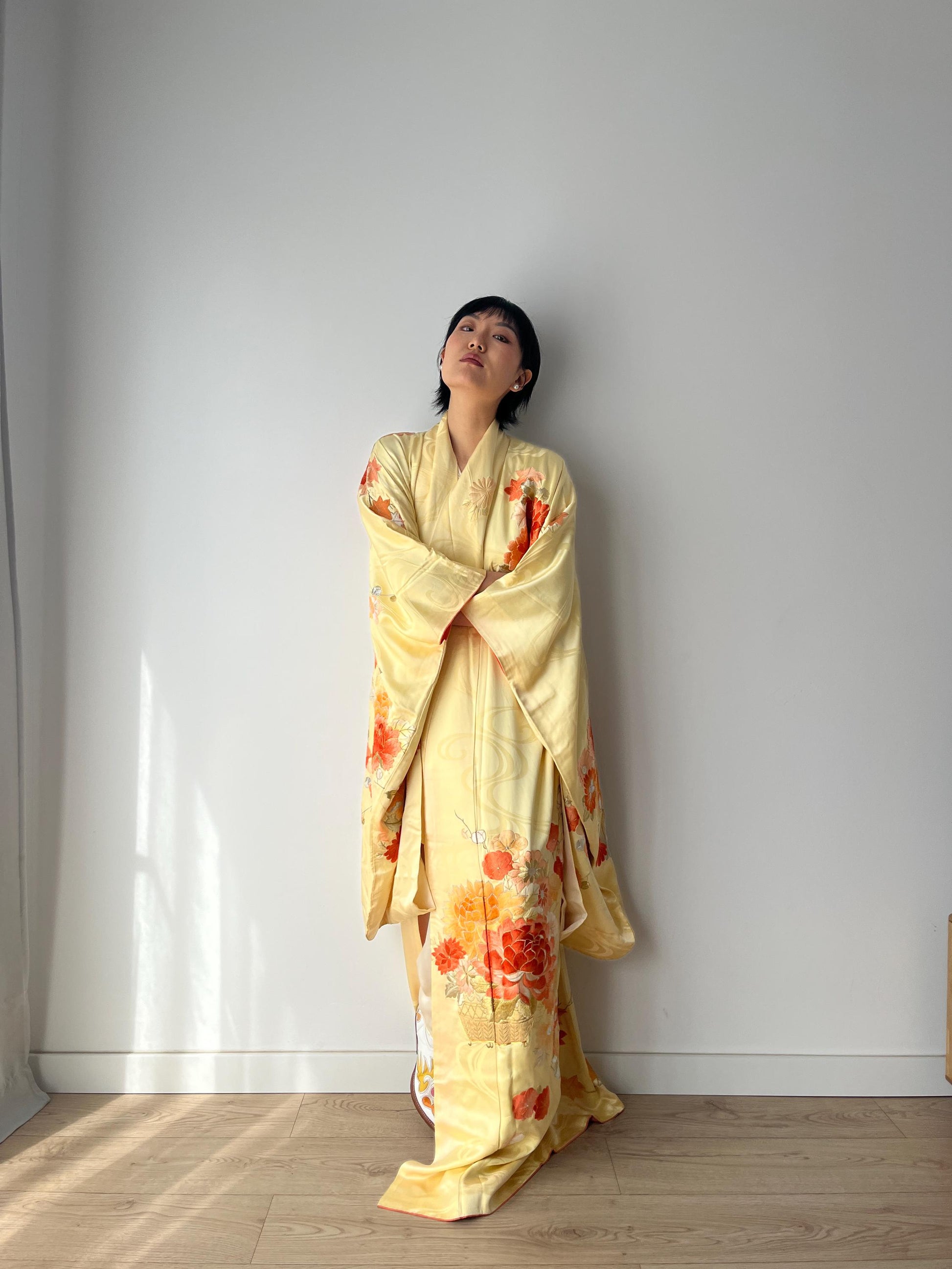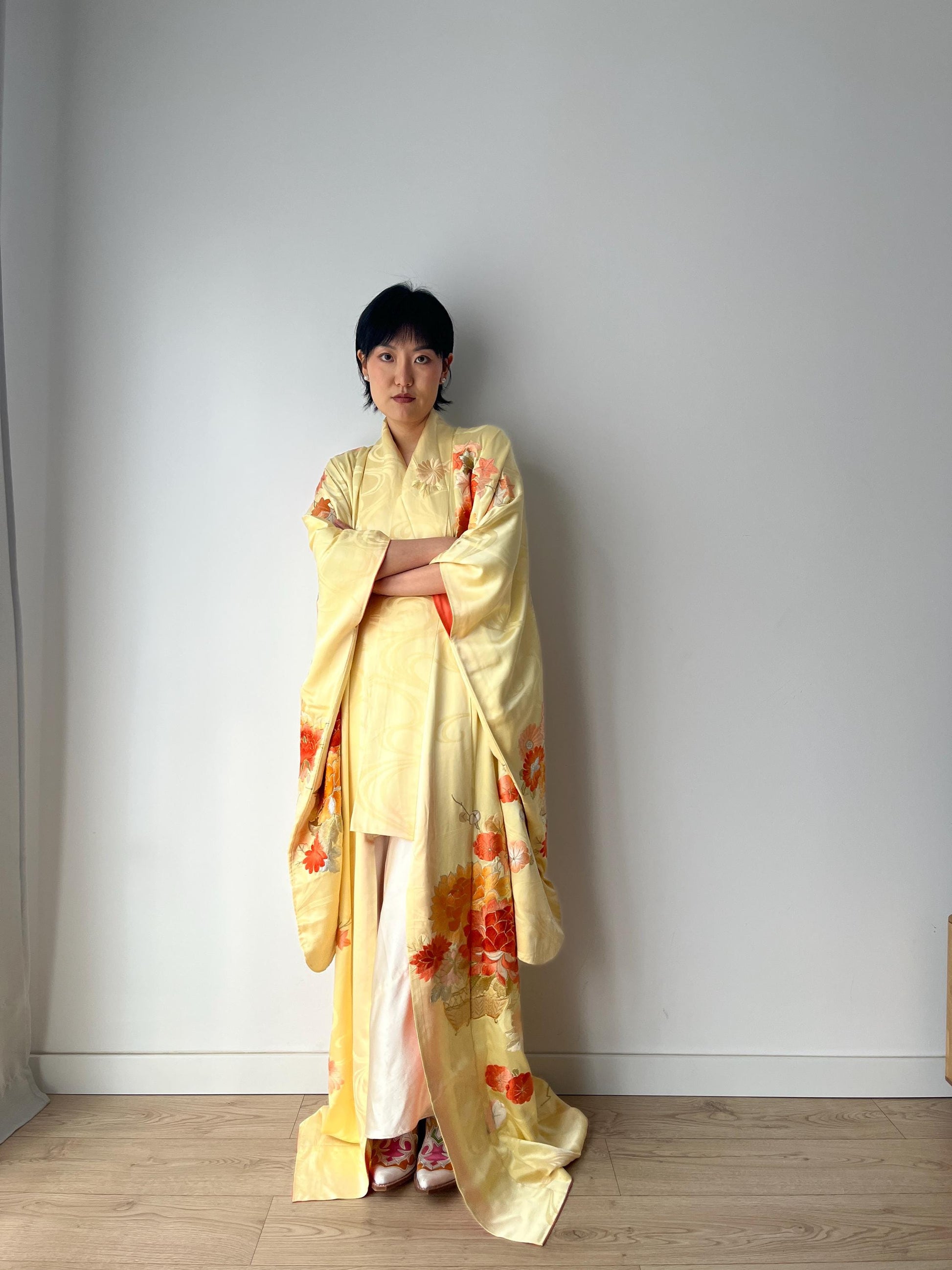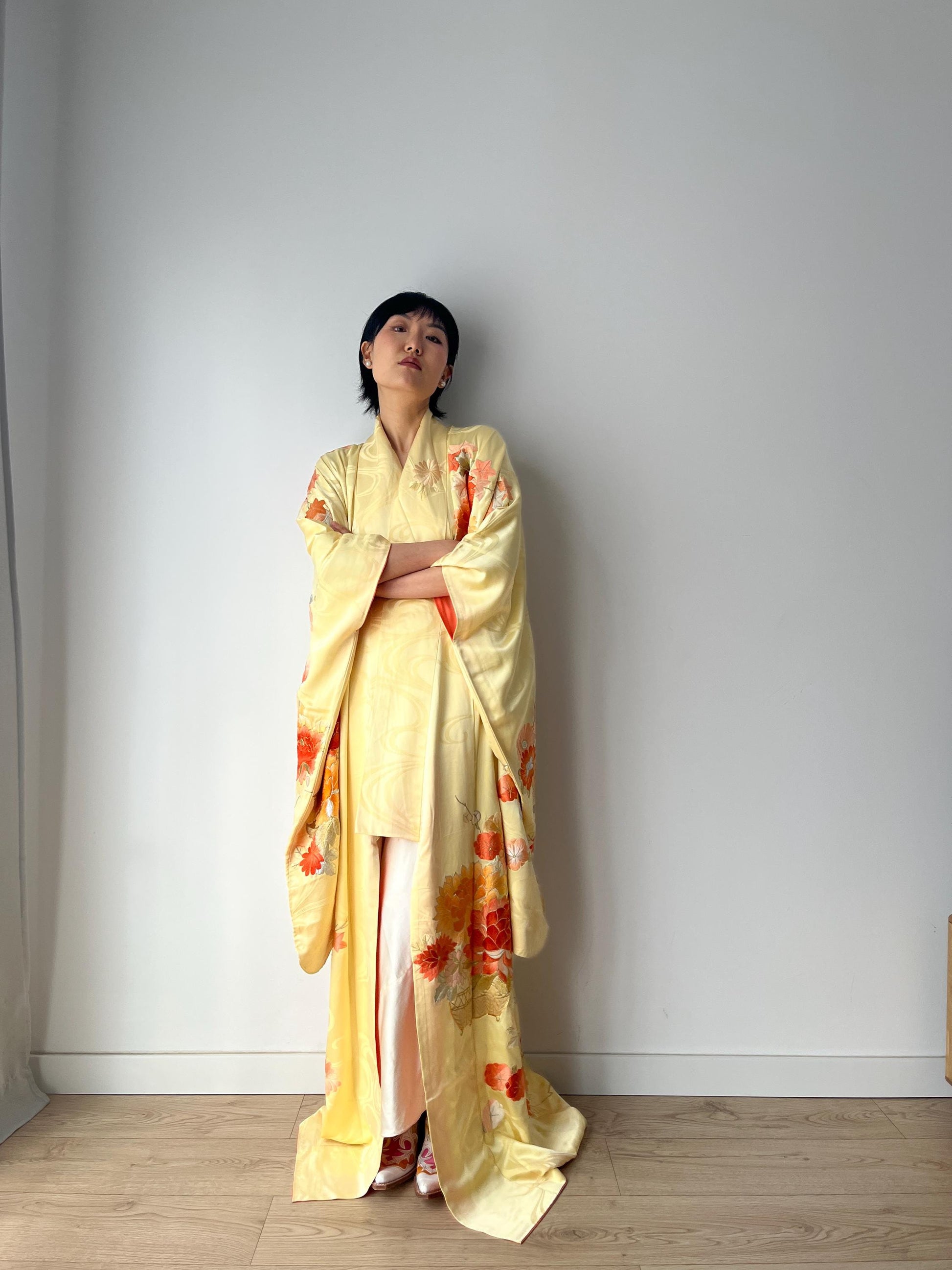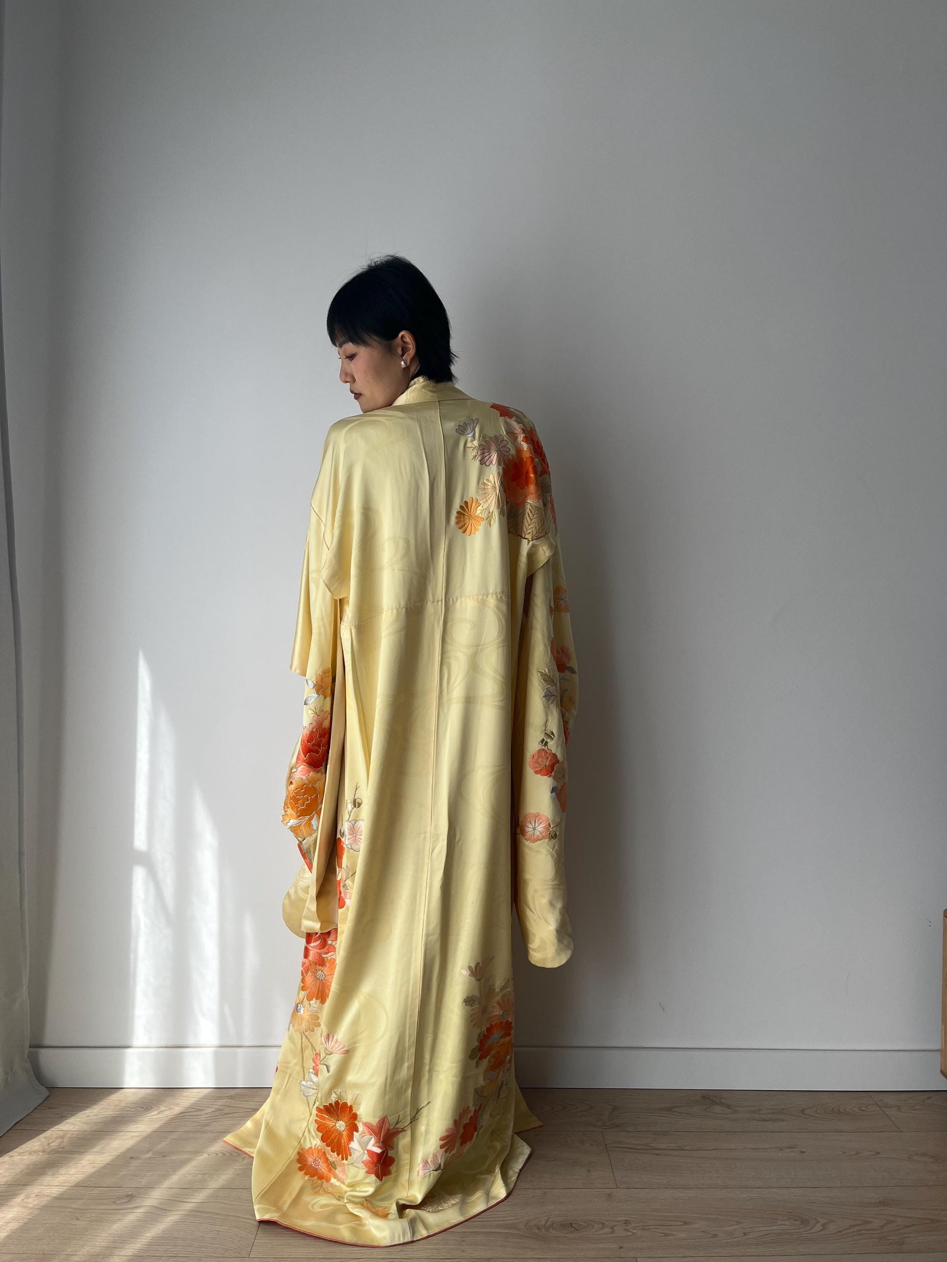 An original Japanese kimono robe with vivid, hand Flower embroidery
