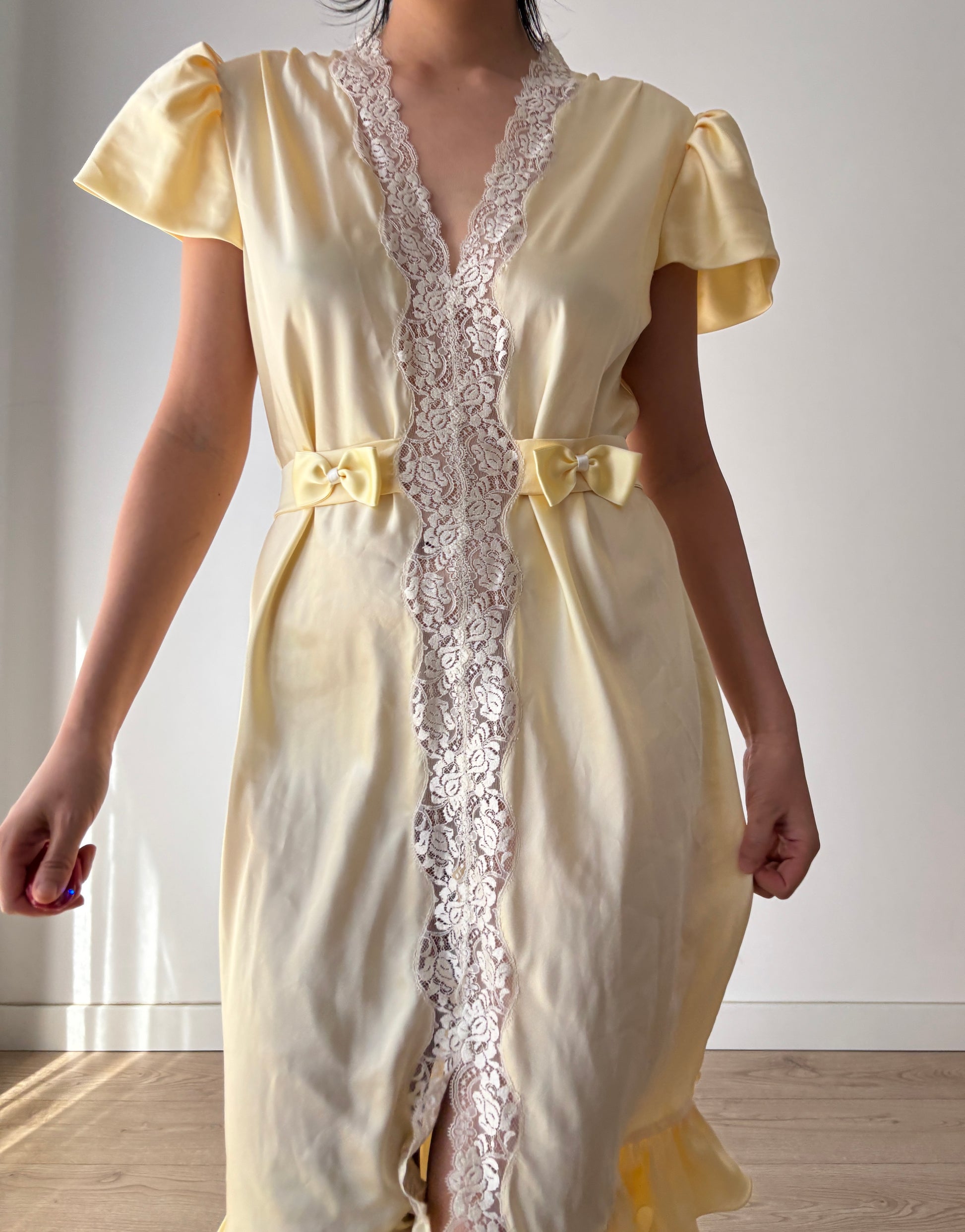 Vintage Yellow Pure Silk Lace Nightgown with Bow & Waist Belt