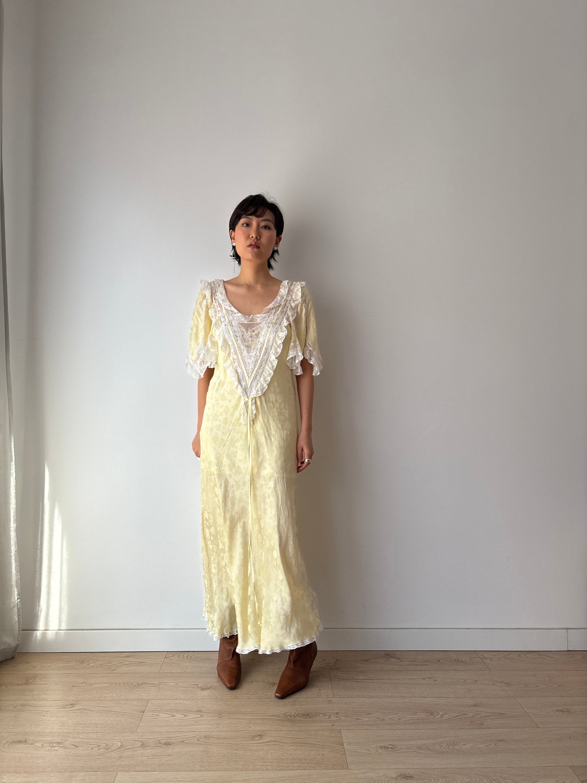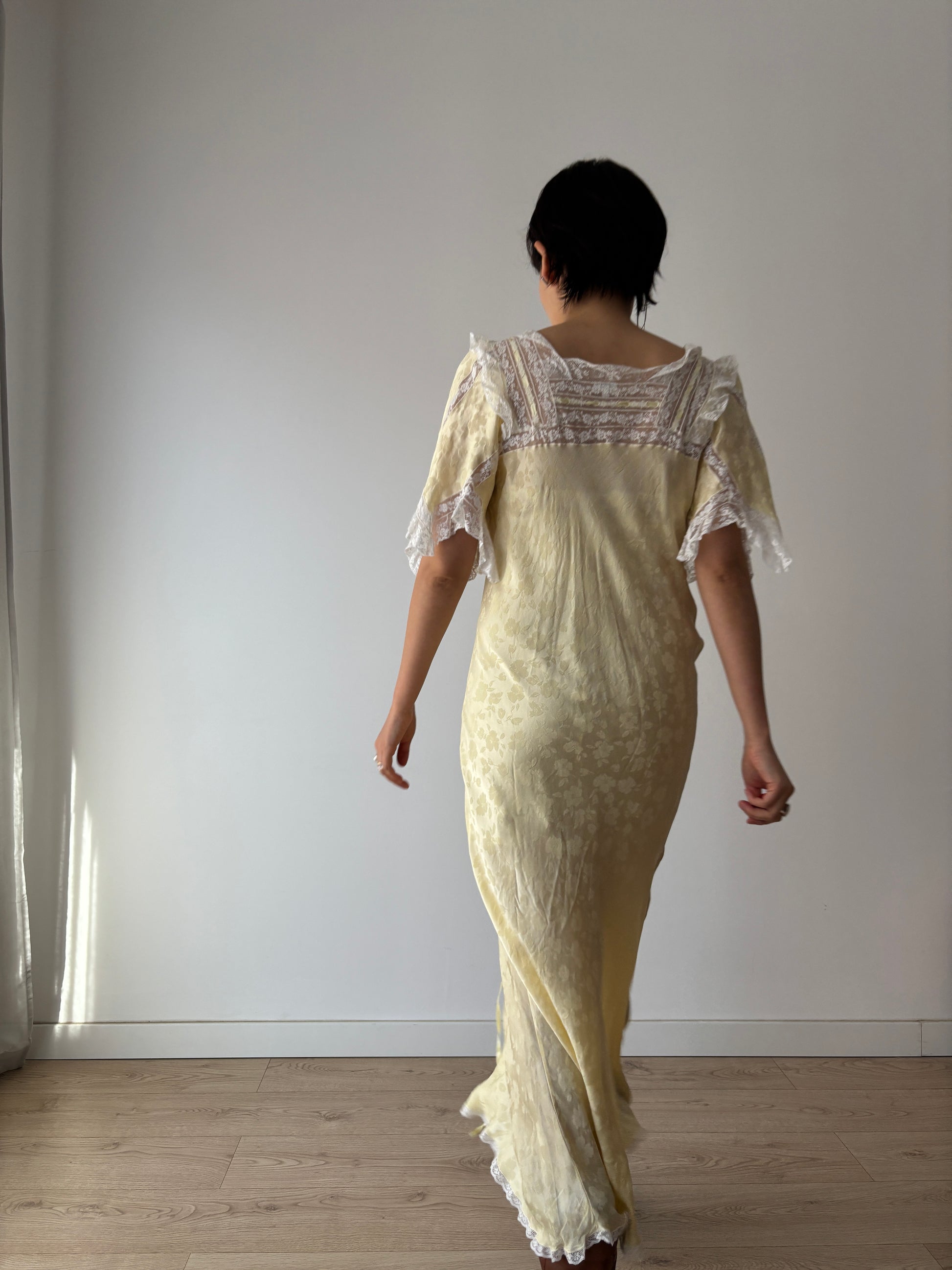 Vintage Yellow Silk Chemise: Floral & Bow Embroidery, Tonal Floral Pattern