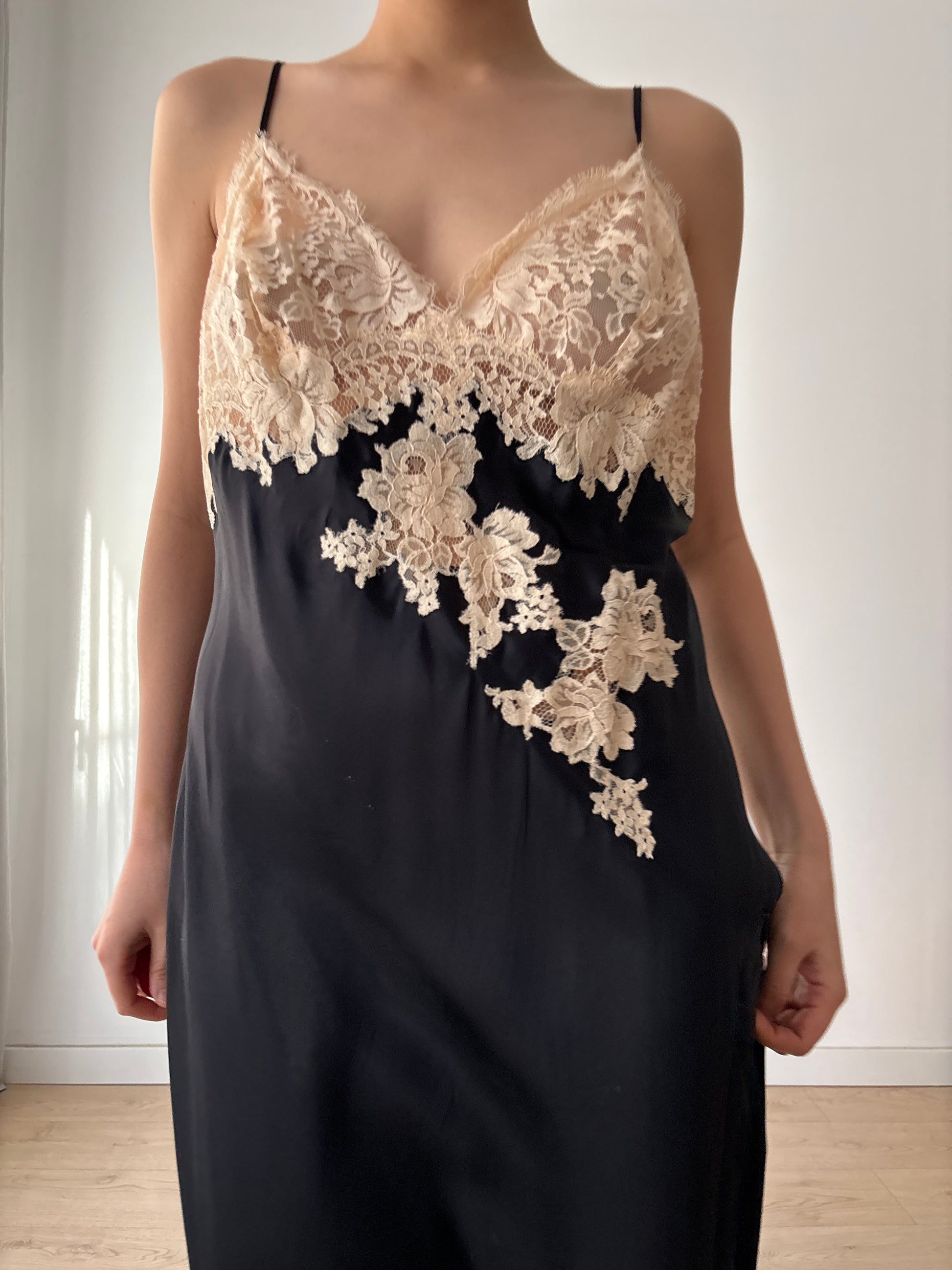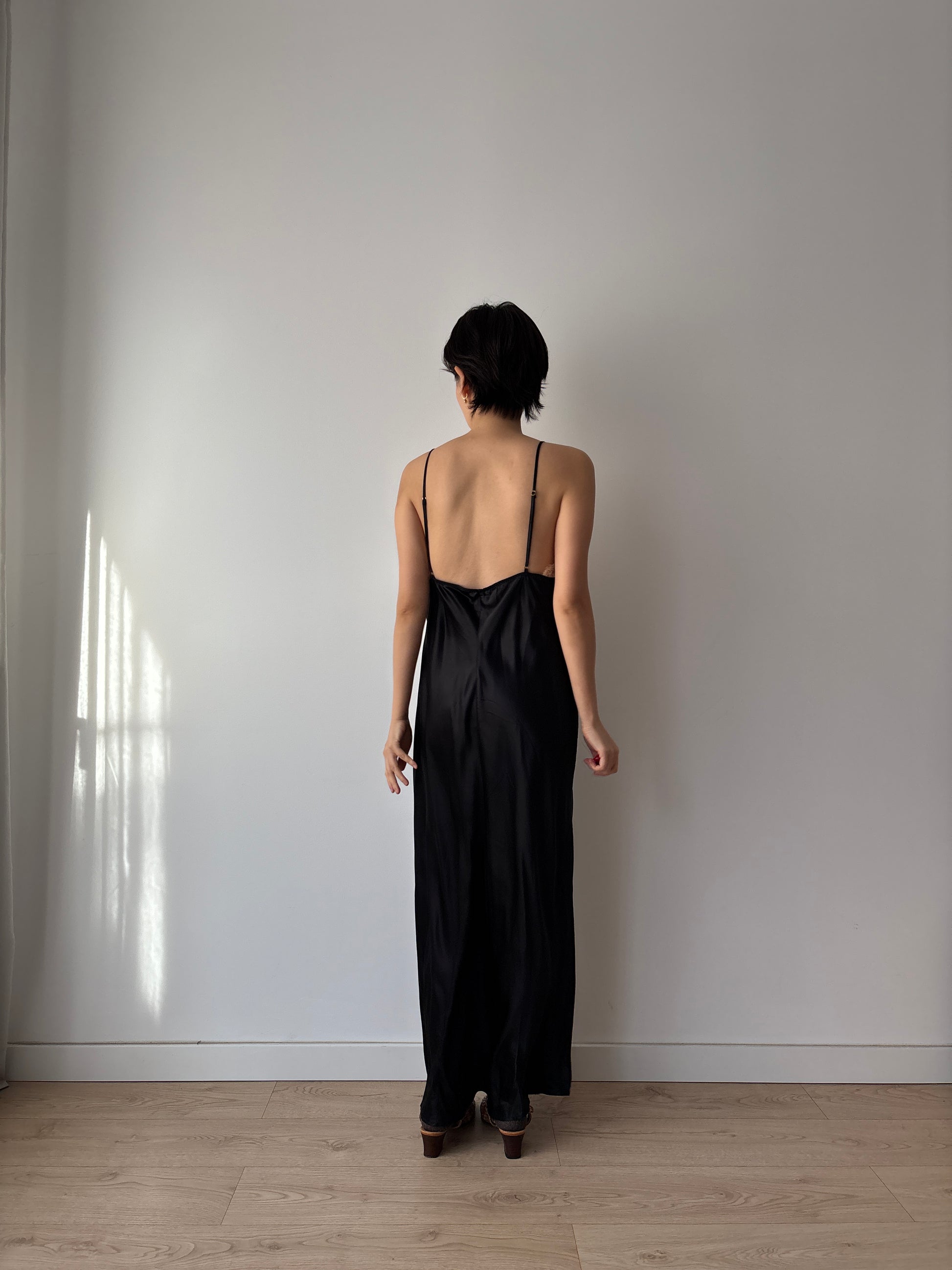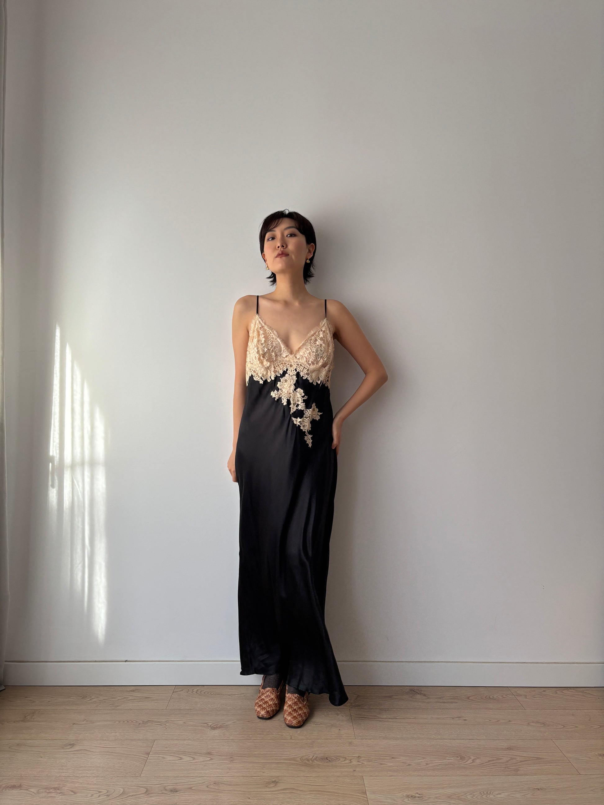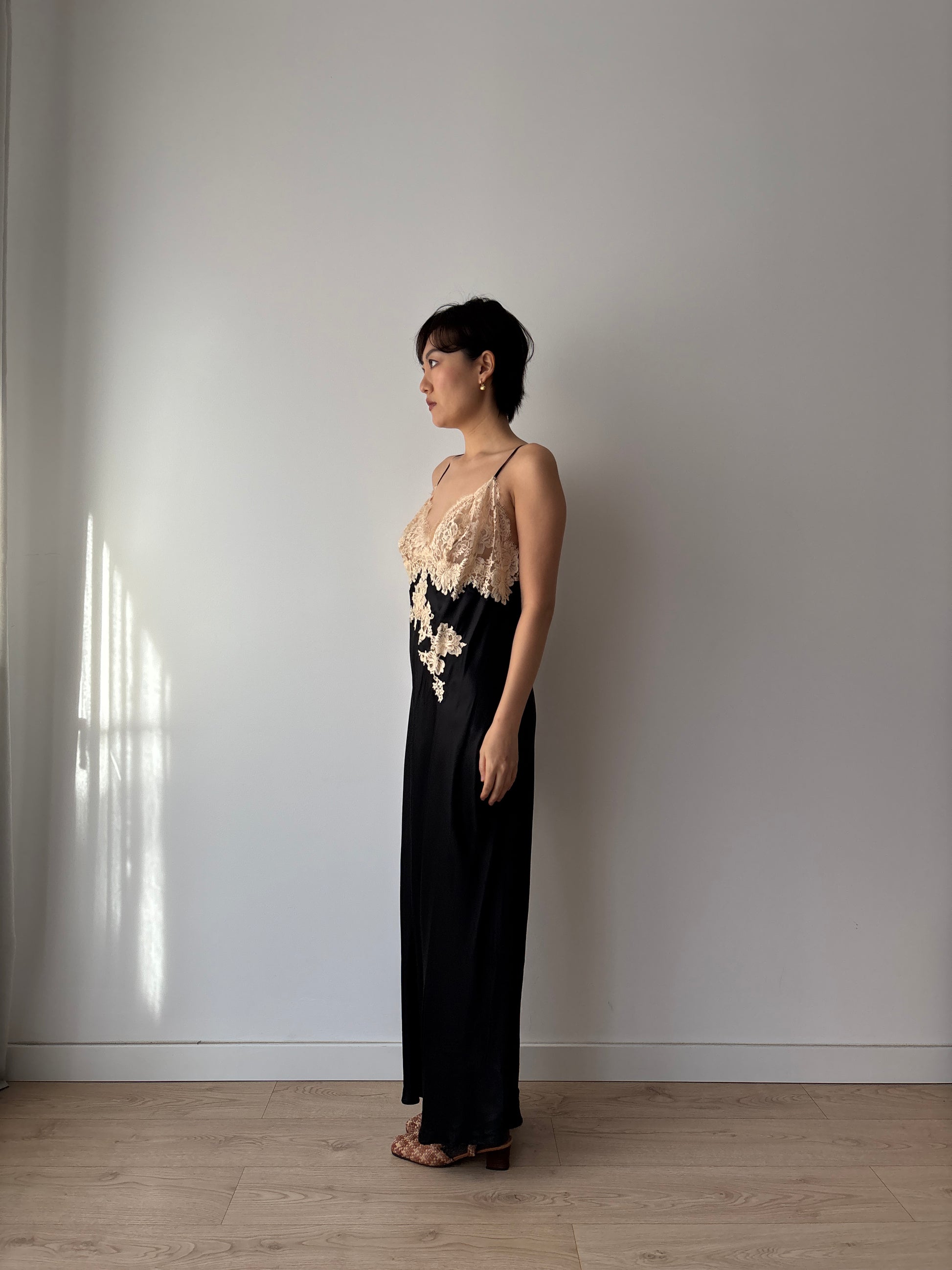 This Y2K-era black silk slip dress embodies minimalist edge with its straight cut silhouette and delicate lace embroidery. The luxurious liquid silk drapes elegantly, making it versatile enough for evening parties or layered for a chic everyday look.