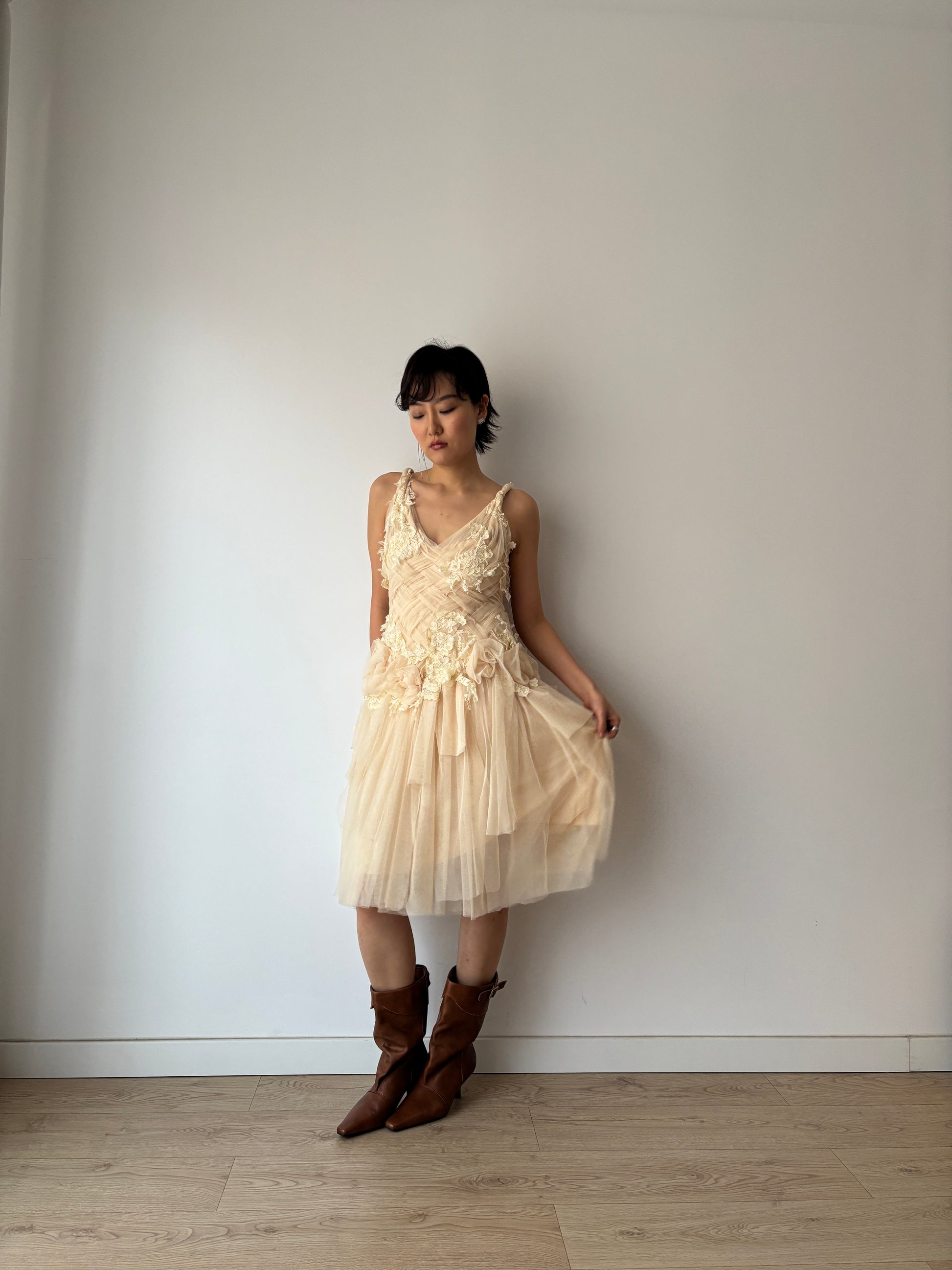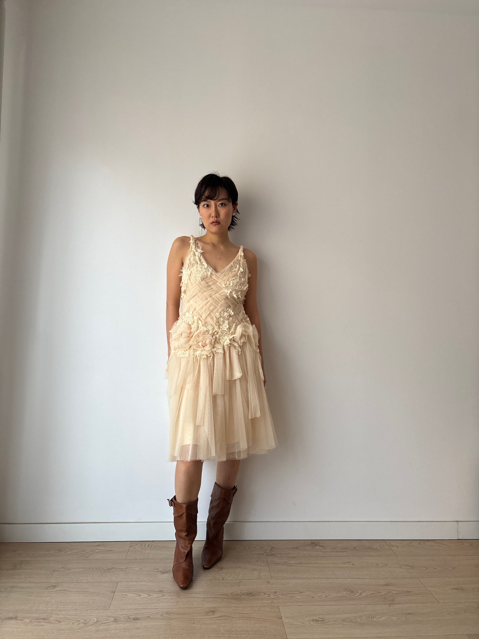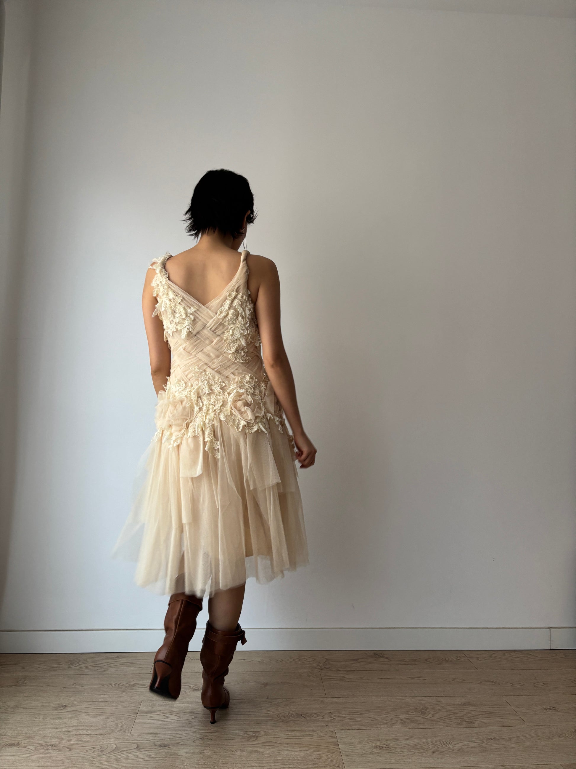 Y2K Romantic Organza Dress: Lace Appliqué Roses, Crisscross Bodice, Layered Skirt & Twisted Straps
